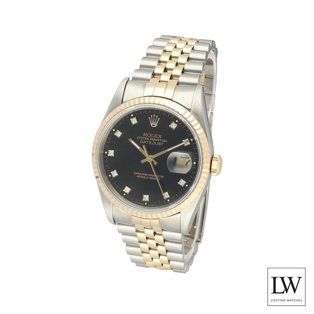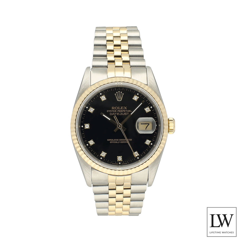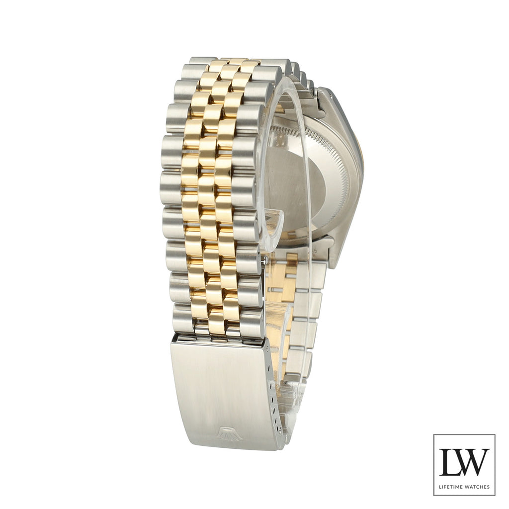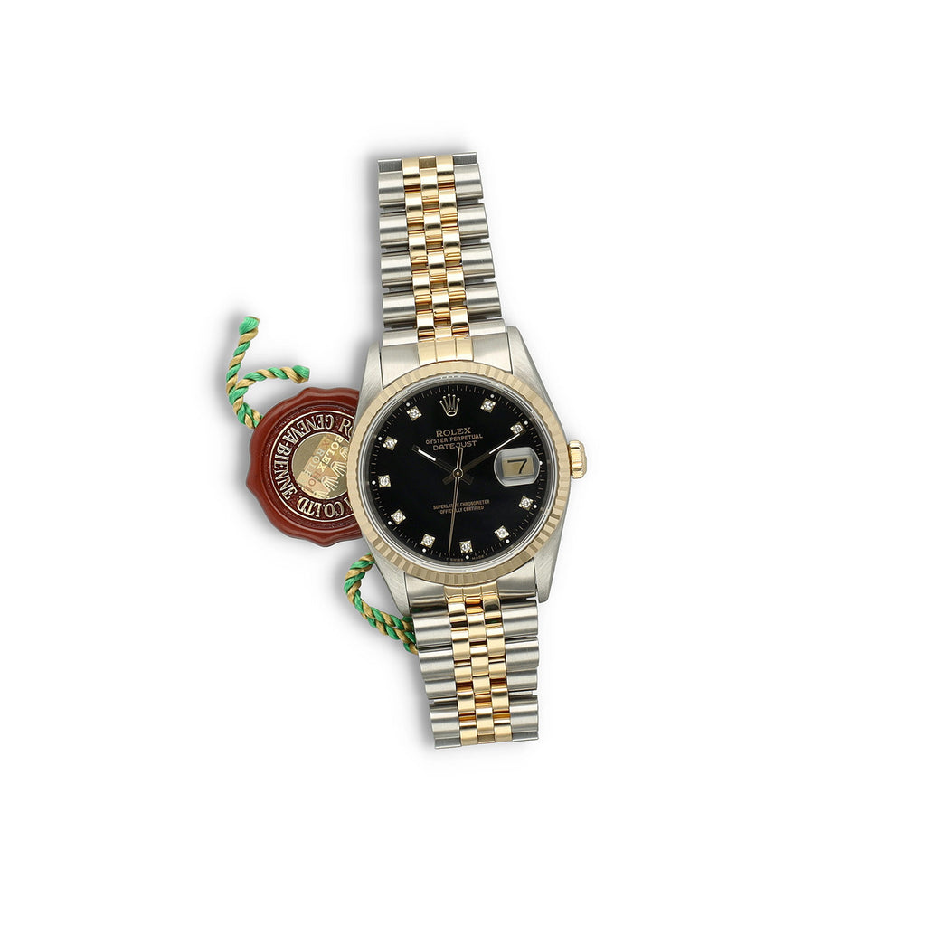 This specific example, the Rolex Datejust 16233 from 1991, is made of Oystersteel and 18 karat yellow gold and features the characteristic fluted bezel. The Black Small Diamonds dial gives this classic 36 mm model a subtly luxurious and refined appearance – a perfect balance between classic elegance and exclusive details.