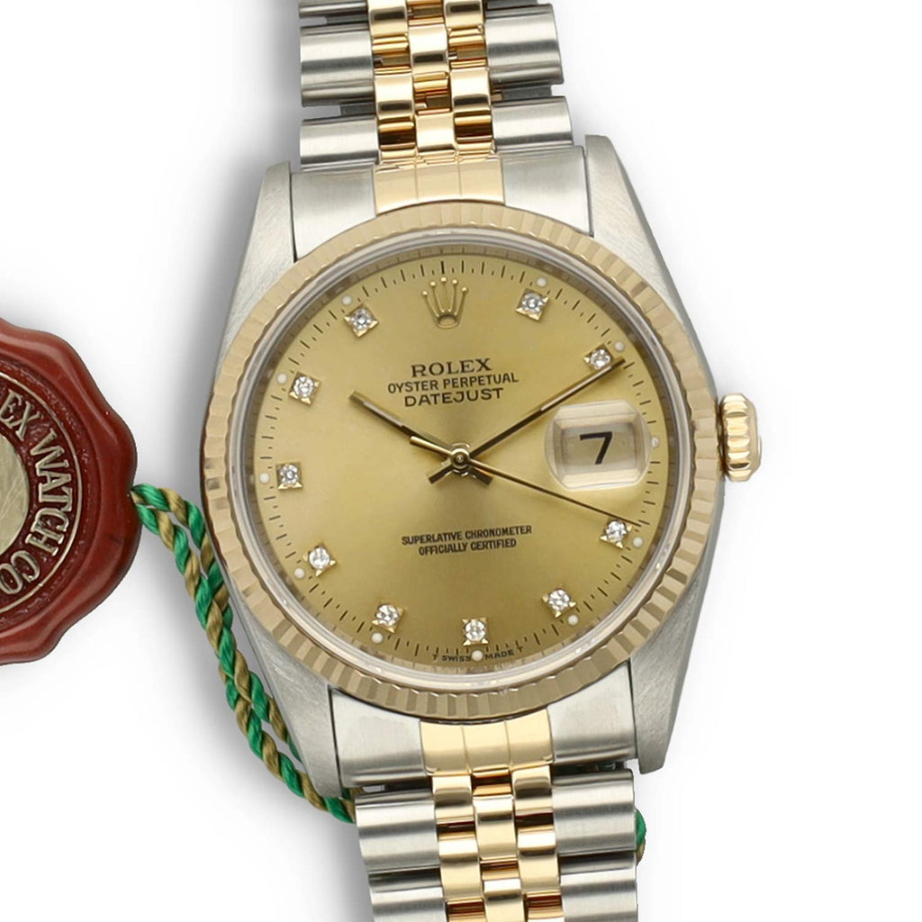 This specific example, the Rolex Datejust 16233 from 1994, is made of Oystersteel and 18 karat yellow gold and features the characteristic fluted bezel. The champagne small diamonds dial gives this classic 36 mm model a subtly luxurious and refined appearance – a perfect balance between elegance and exclusivity.
