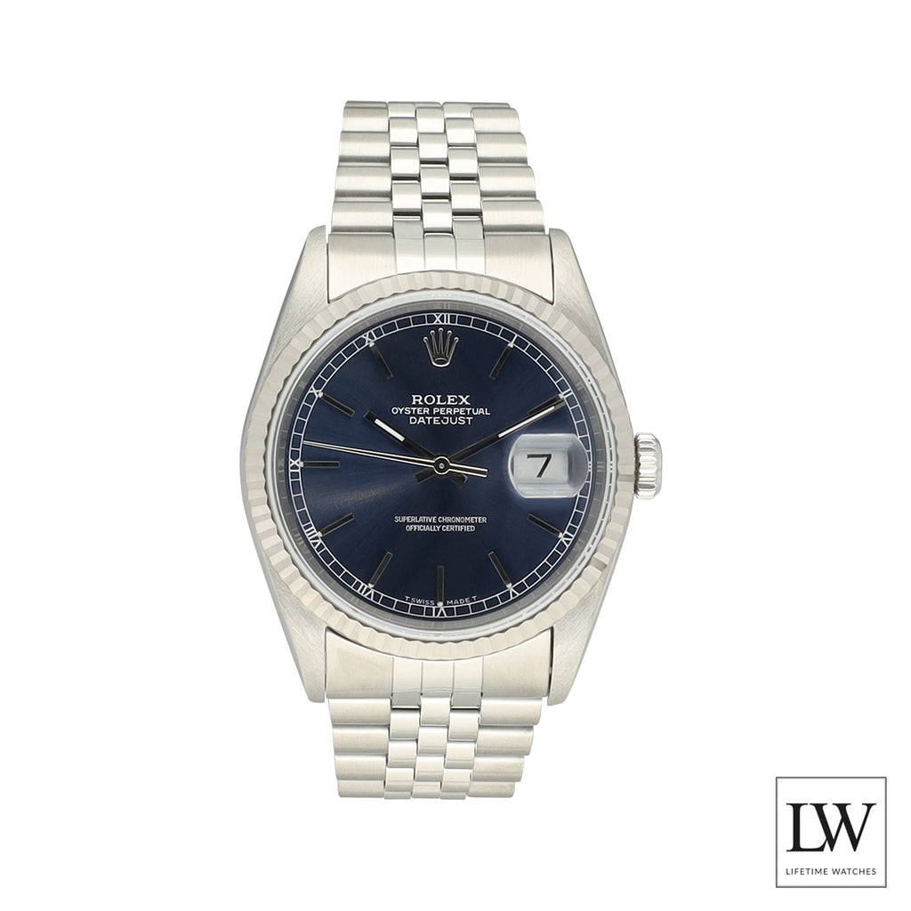 The Rolex Datejust 16234 combines classic elegance with the refined technology Rolex is known for. This special piece from 1994 features a 36 mm Oystersteel case, equipped with a white gold fluted bezel that catches the light in a subtle and luxurious way. The blue dial with minute track gives the watch a stylish, refined, and beloved appearance — a configuration that is becoming increasingly rare on the market.