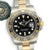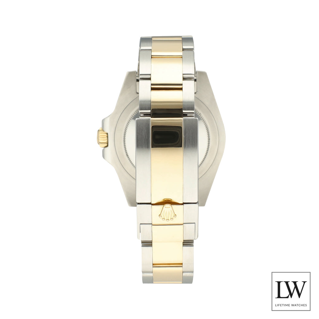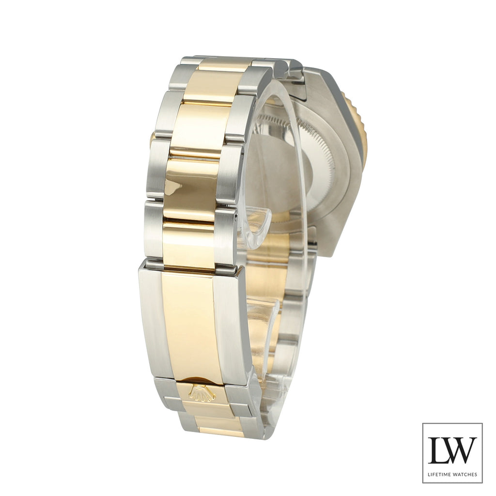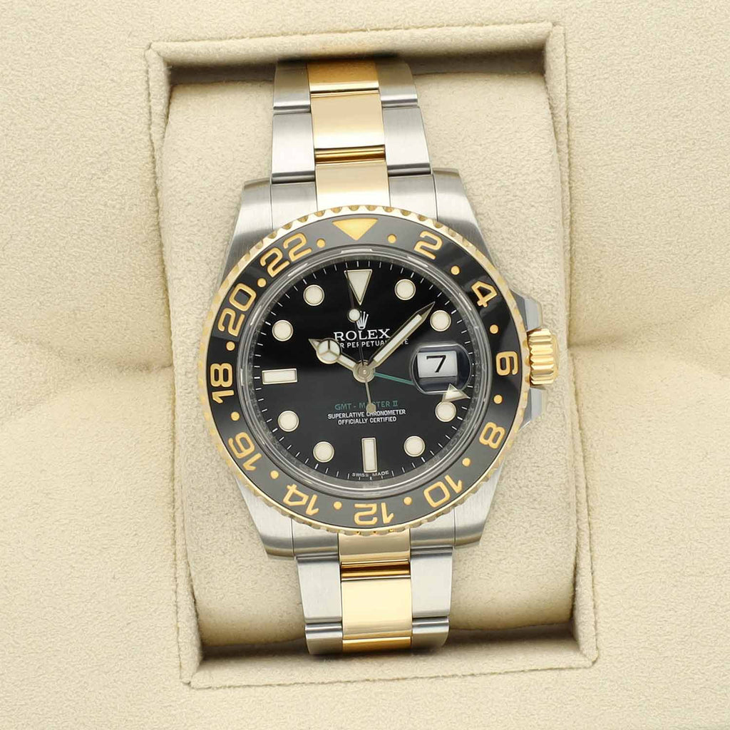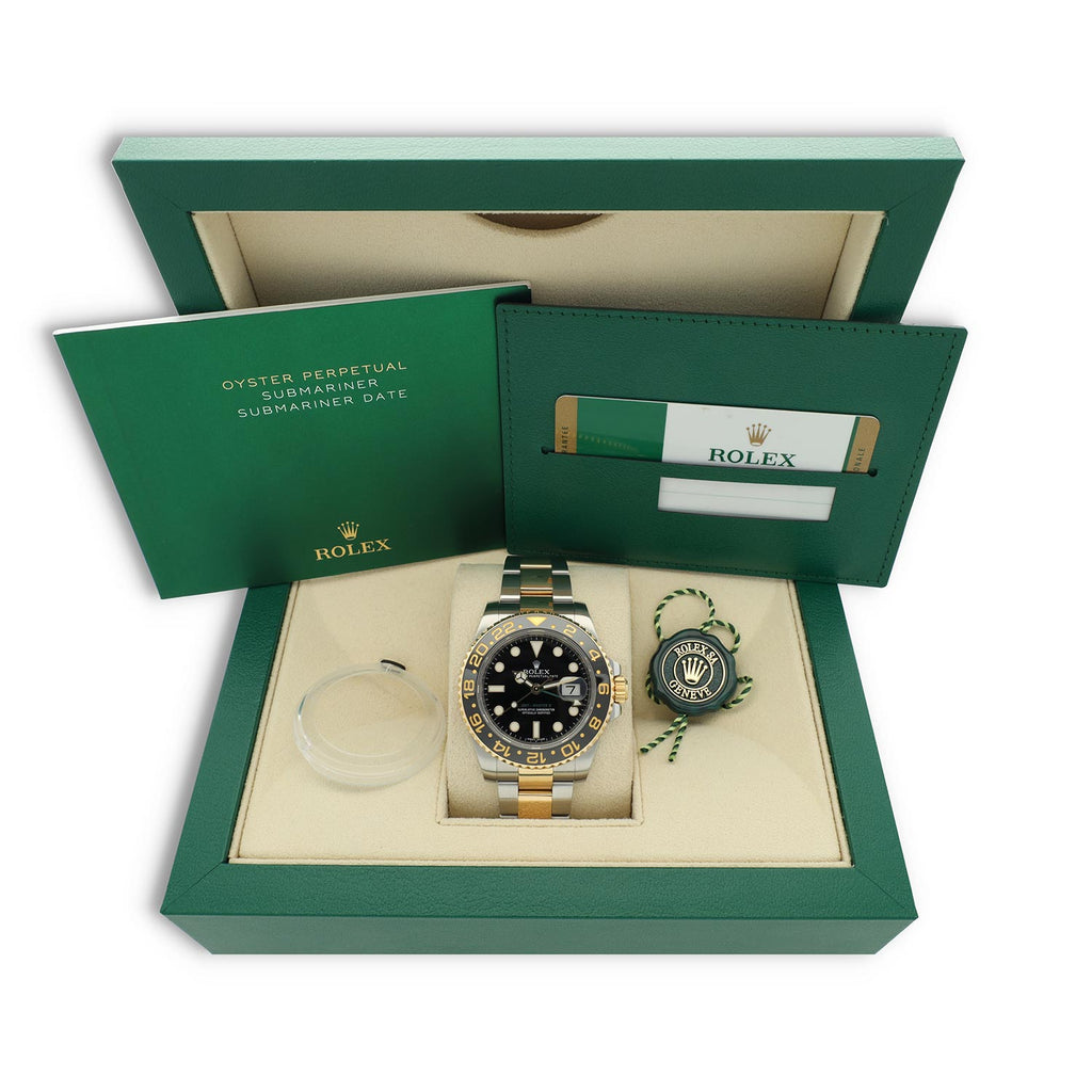 This specific piece, the Rolex GMT-Master II 116713LN, combines sporty elegance with technical refinement. The 40 mm case is made of Oystersteel and 18 karat yellow gold and framed by a black Cerachrom bezel with 24-hour markings, allowing the second time zone to be easily read. The black dial with gold accents gives the watch a powerful and luxurious appearance.