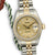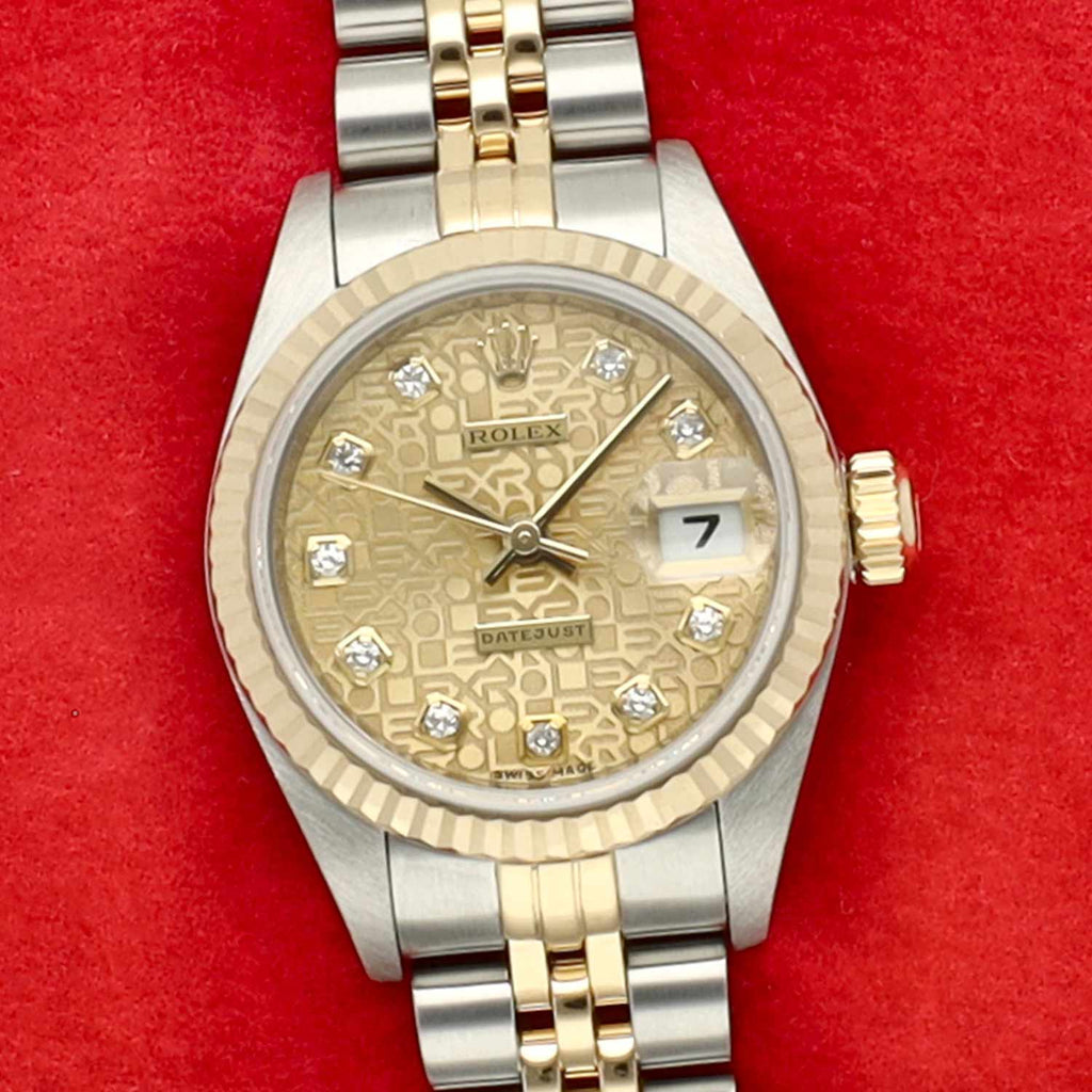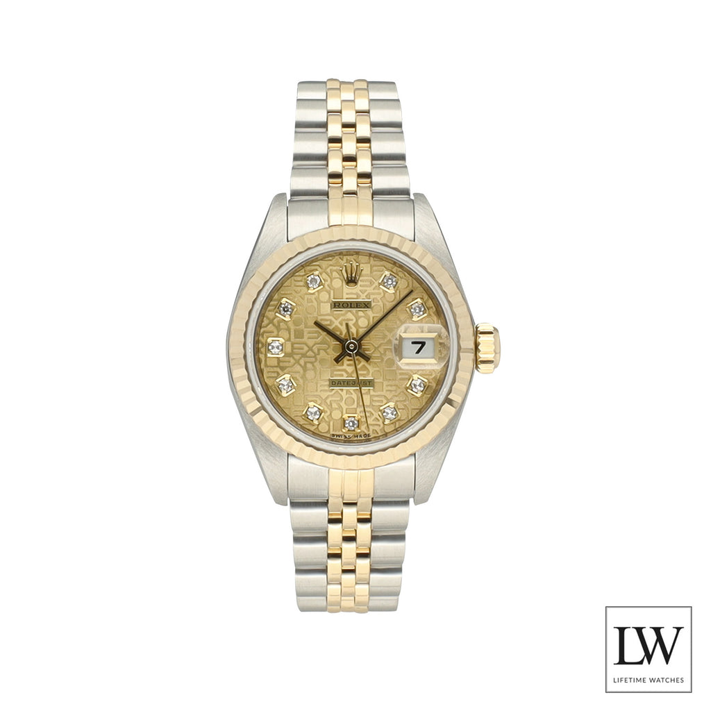 This Rolex Lady-Datejust 79173 from 2001 is made of Oystersteel and 18 karat yellow gold with a 26 mm case and a fluted bezel. The champagne-colored Jubilee dial with diamonds gives this watch a luxurious appearance. The set is completed by the elegant Jubilee bracelet with folding clasp. The automatic movement is a certified chronometer with a power reserve of approximately 48 hours.
