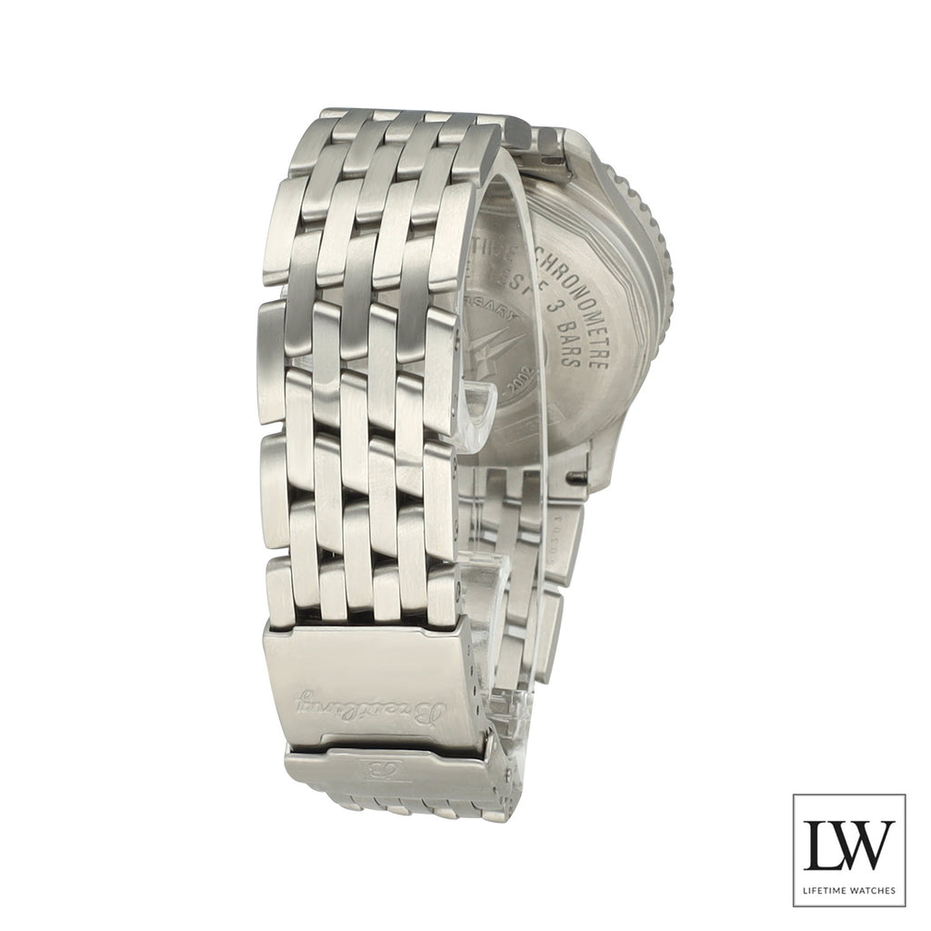 Dit exemplaar is uitgevoerd met een zwarte wijzerplaat en behoudt alle klassieke Navitimer-elementen: de kenmerkende rekenliniaal (slide-rule bezel), de drukke maar perfect leesbare dial en de robuuste chronograaf-functie. Het horloge ademt pure toolwatch-historie, gecombineerd met tijdloze elegantie.