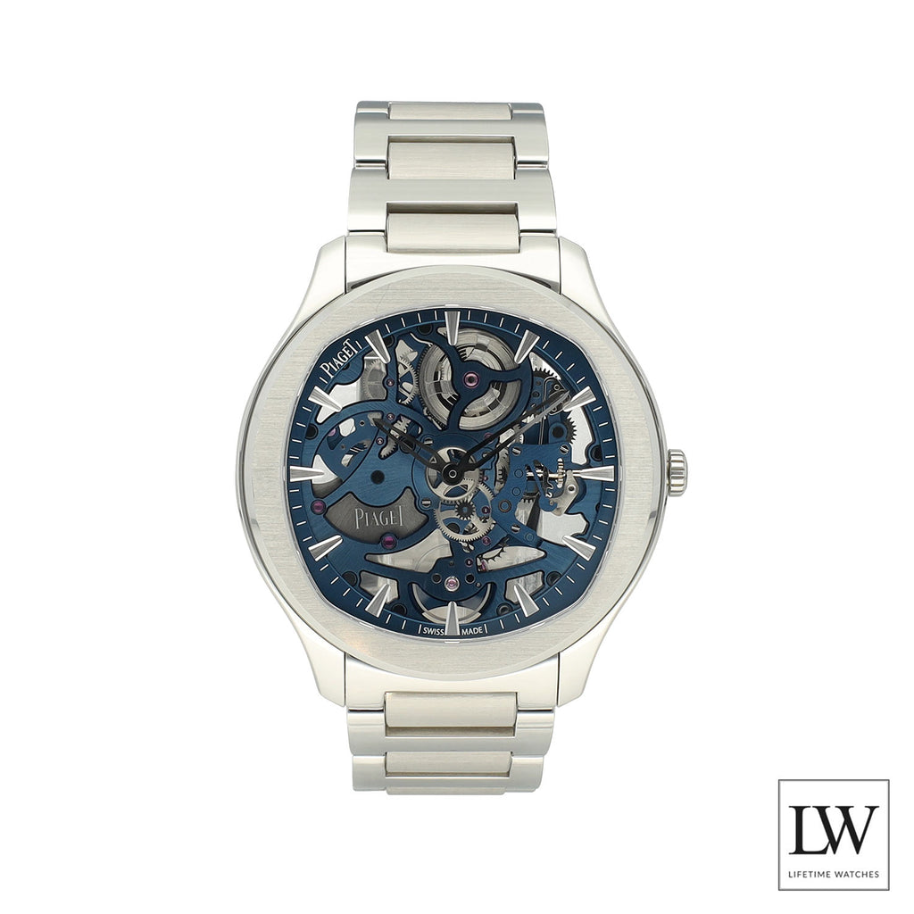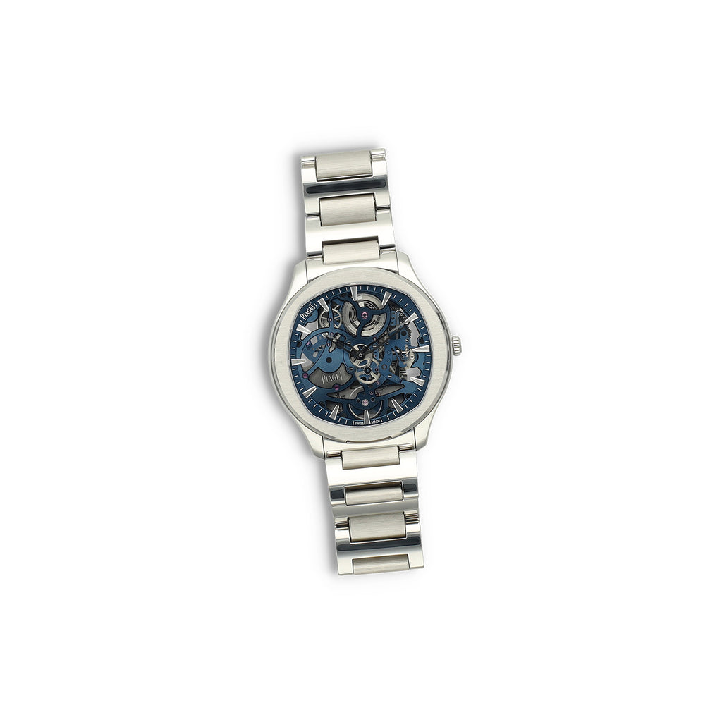 Dit moderne Polo Skeleton-model valt direct op door de indrukwekkende blauwe skeleton wijzerplaat, waarin het ultra-dunne manufactuurkaliber 1200S1 volledig zichtbaar is. De 42 mm roestvrijstalen kast, met een dikte van slechts 6,5 mm, benadrukt Piaget’s meesterschap in ultra-dunne uurwerken, terwijl de transparante saffierglazen achterzijde een prachtig zicht biedt op het mechaniek.