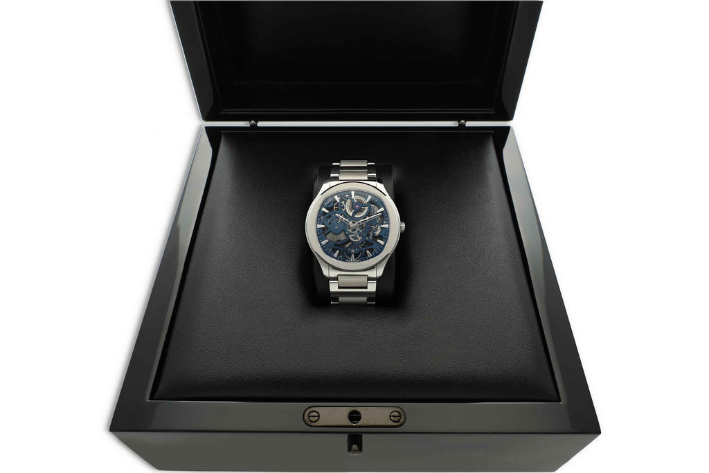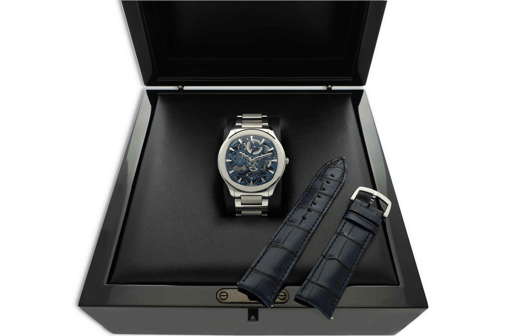 Het horloge wordt geleverd op een roestvrijstalen armband en bevat daarnaast een extra blauwe alligator lederen band, eenvoudig te wisselen dankzij Piaget’s praktische QuickSwitch-systeem. Met een perfecte balans tussen technische innovatie en moderne elegantie is de Polo Skeleton een statement piece voor zowel verzamelaars als liefhebbers.
