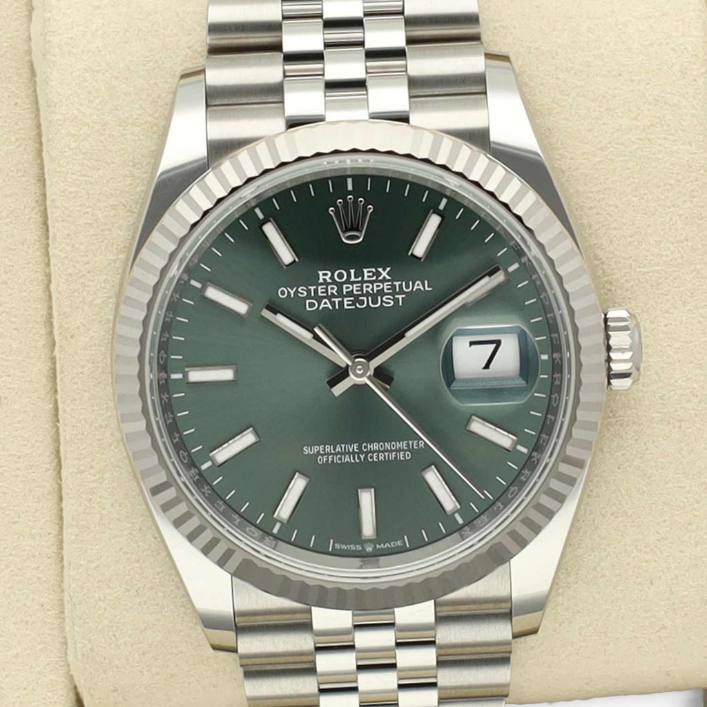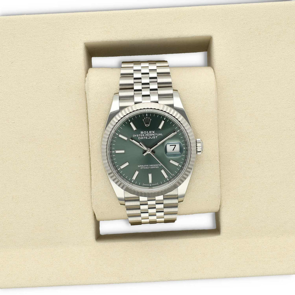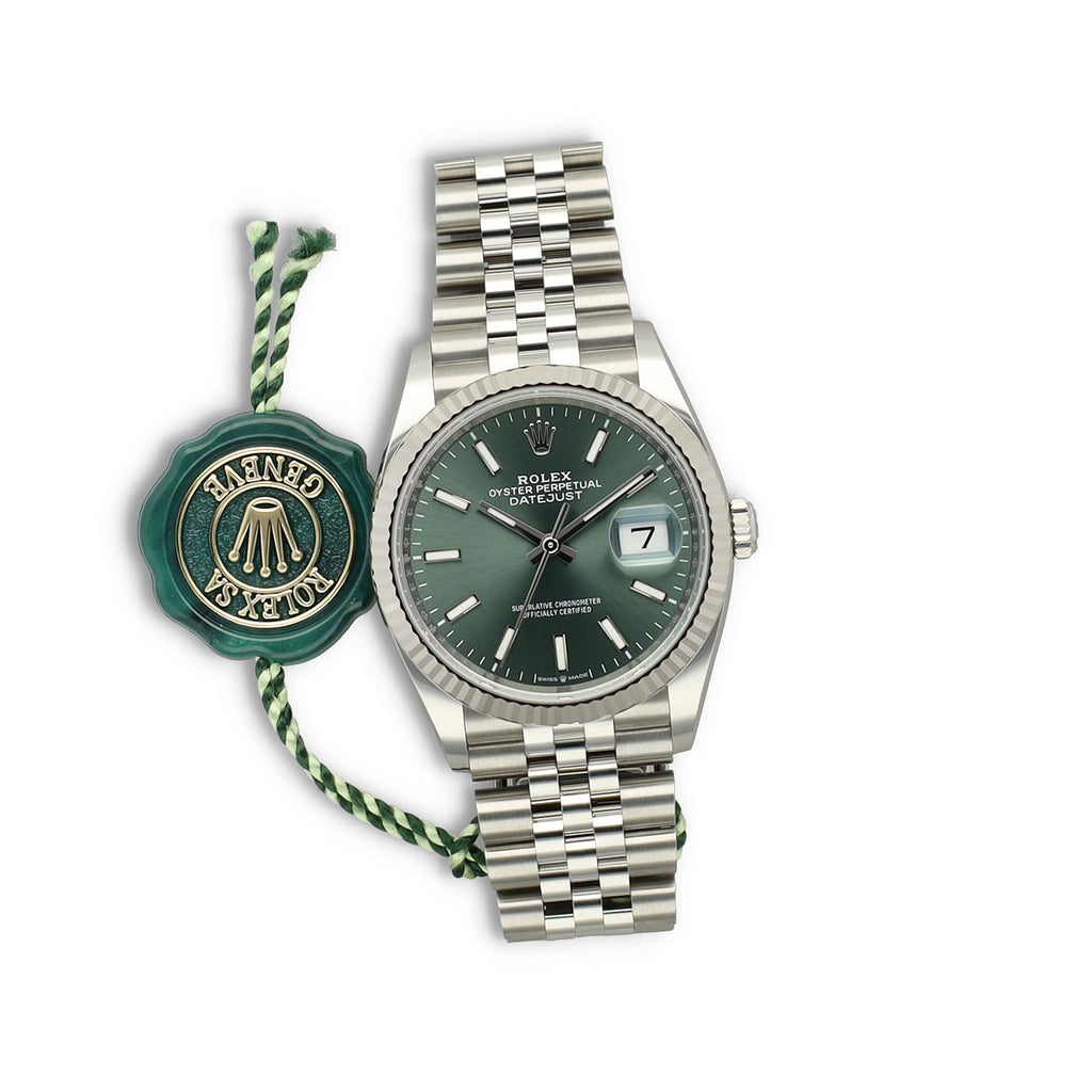 Deze Rolex Datejust 126234 uit 2025 is uitgevoerd met een 36 mm Oystersteel-kast, een witgouden gekartelde bezel en een opvallende groene wijzerplaat. De Jubilee-band met vouwsluiting zorgt voor comfort en elegantie. Het automatische uurwerk is een gecertificeerde chronometer met een gangreserve van circa 70 uur.