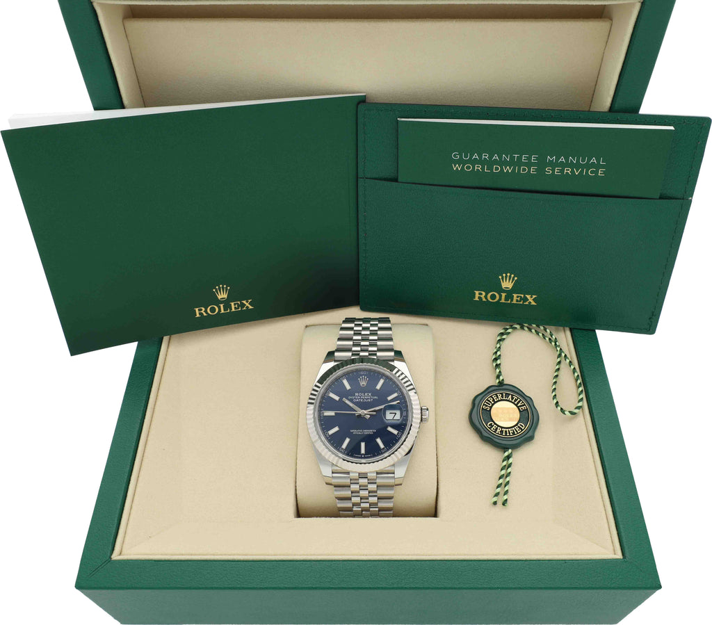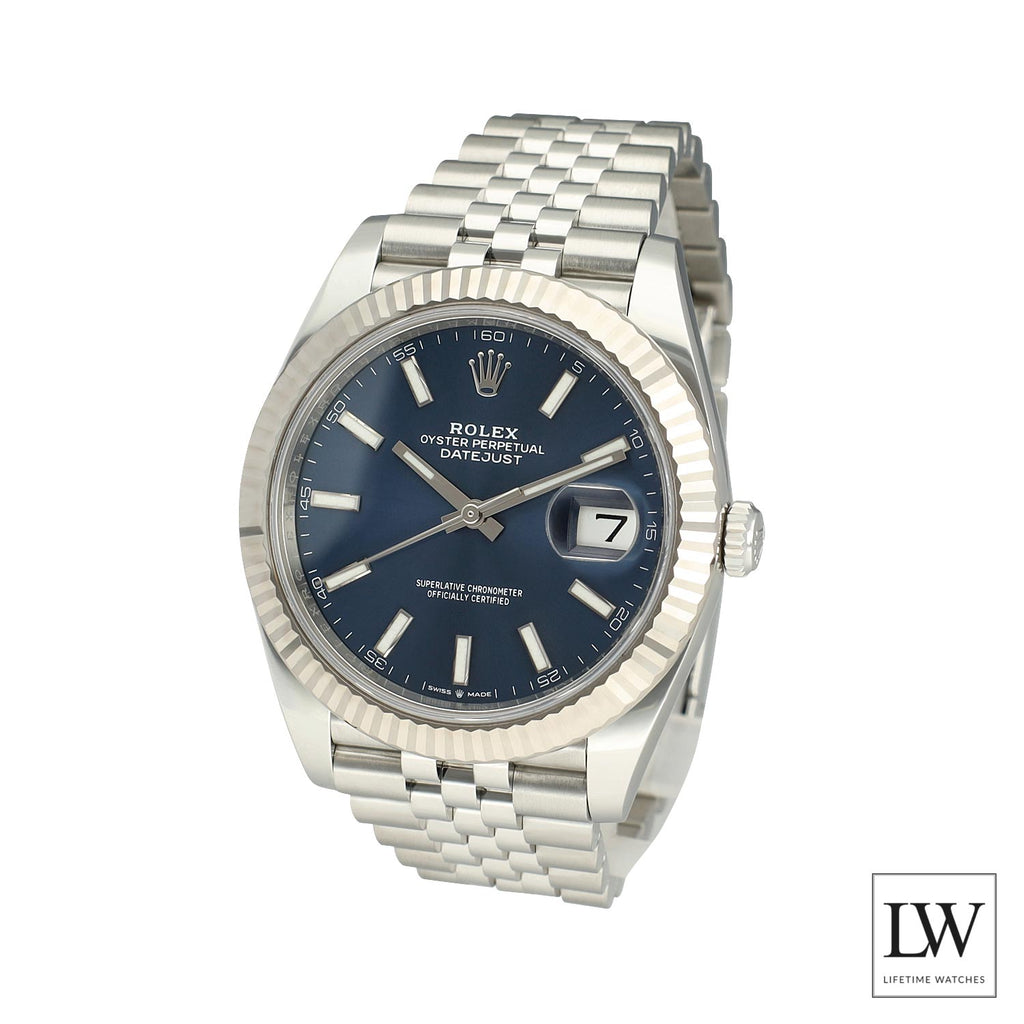 Dit exemplaar, de Datejust 126334, verkeert in nieuwe conditie en beschikt over een 41 mm Oystersteel-kast, een blauwe wijzerplaat, een gekartelde bezel en de elegante Jubilee-band. Het automatische uurwerk heeft een gangreserve van circa 70 uur en is waterdicht tot 100 meter.