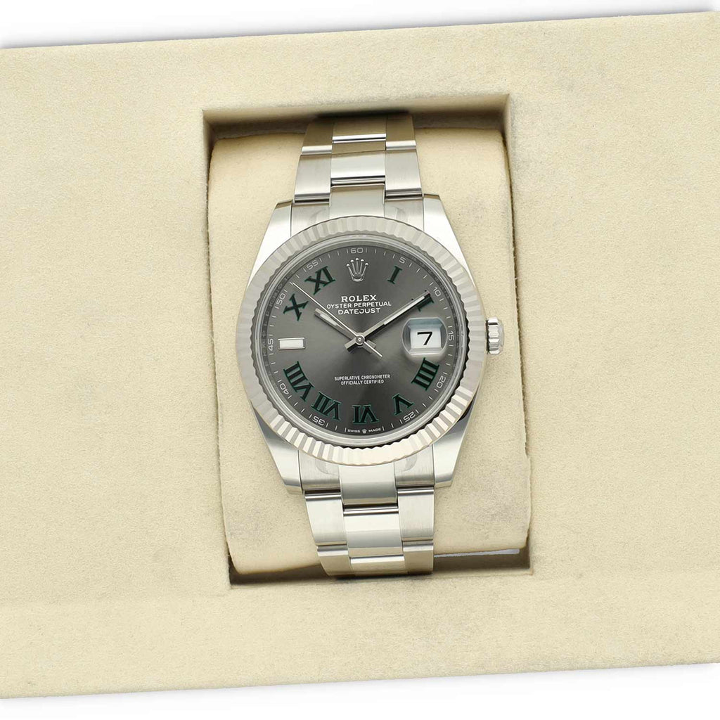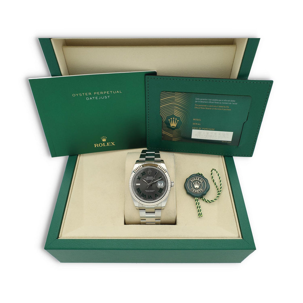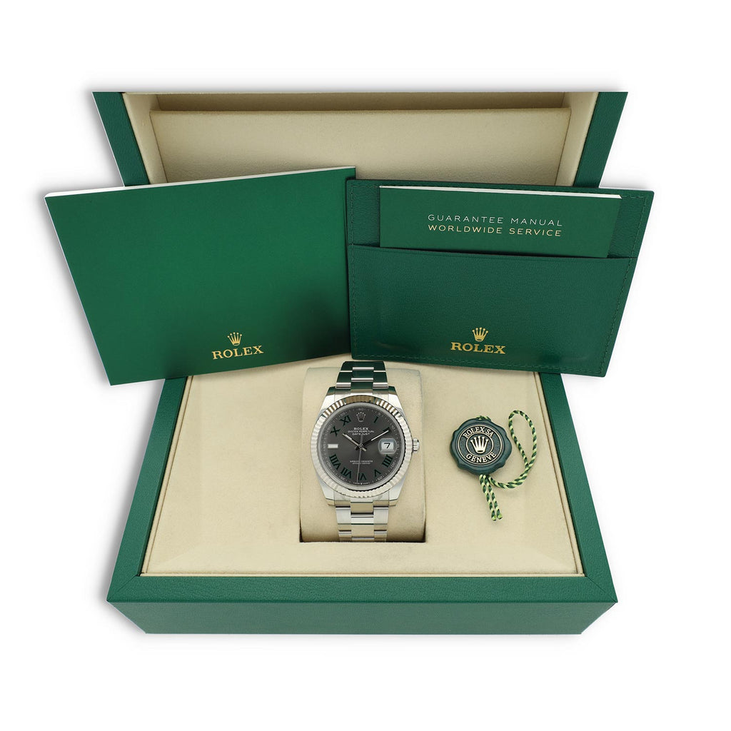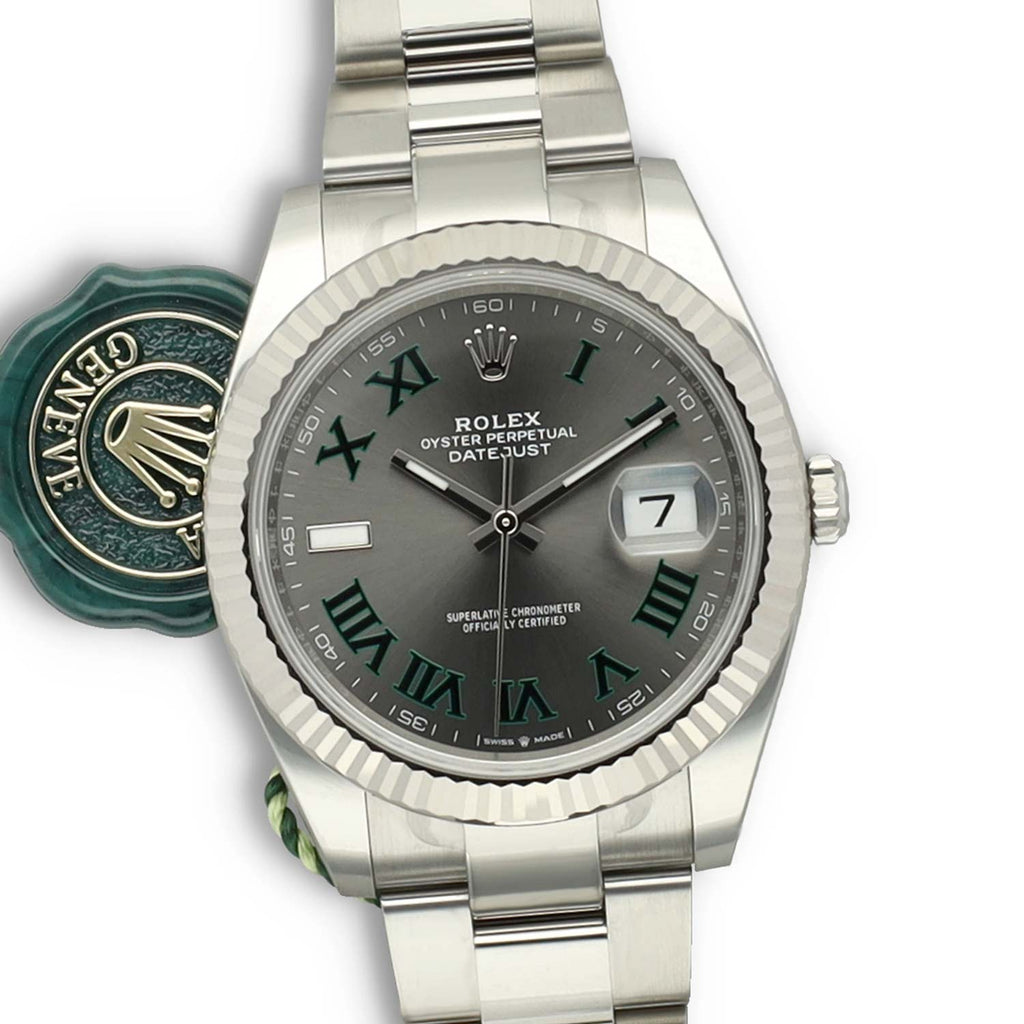 Dit specifieke exemplaar betreft de Rolex Datejust 126334 Wimbledon en verkeert in nieuw staat (unworn). Het horloge is uitgevoerd met een 41 mm Oystersteel-kast, een leigrijze Wimbledon-wijzerplaat met groene Romeinse cijfers, een gekarteerde bezel van 18k witgoud en de sportieve Oyster-band. Het automatische Rolex uurwerk biedt een gangreserve van circa 70 uur en is waterdicht tot 100 meter.