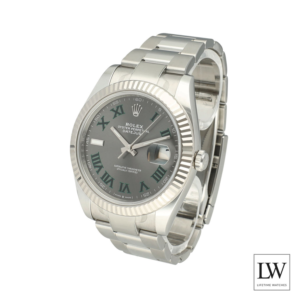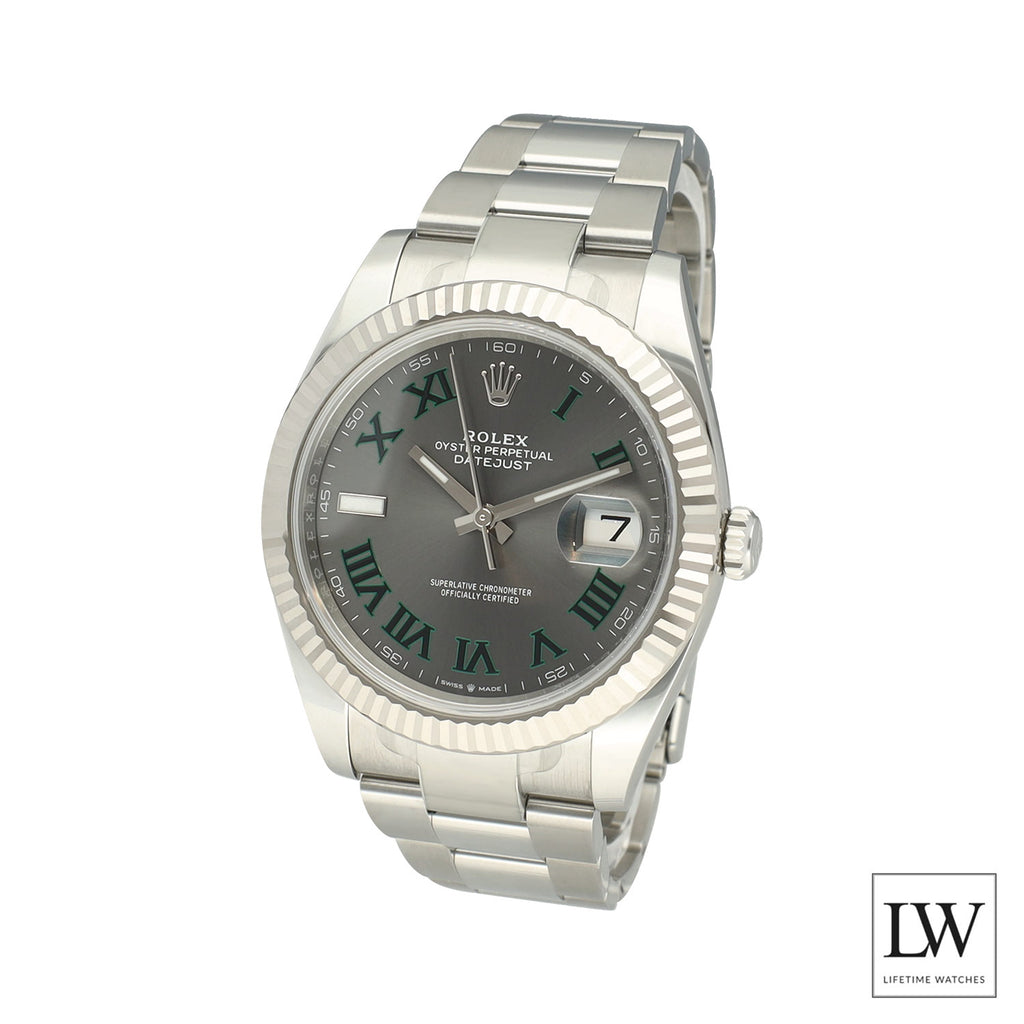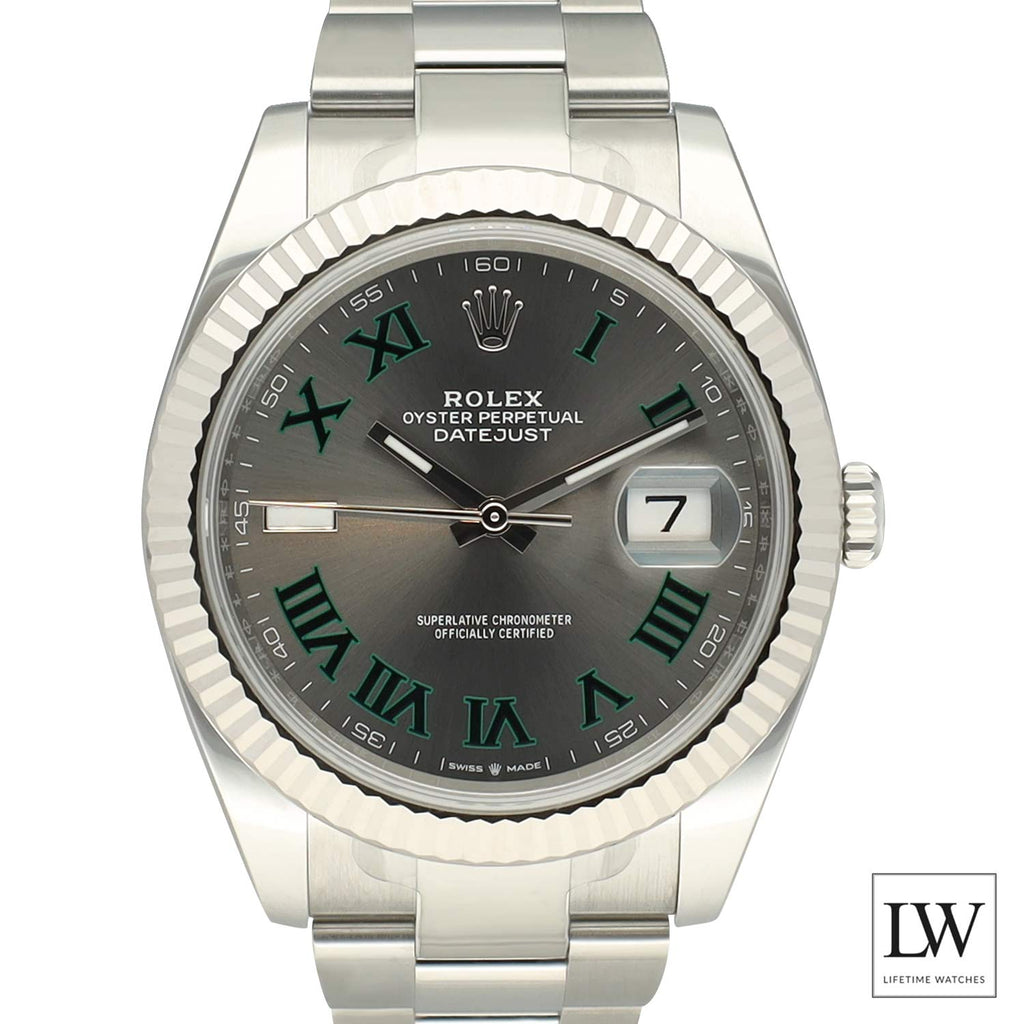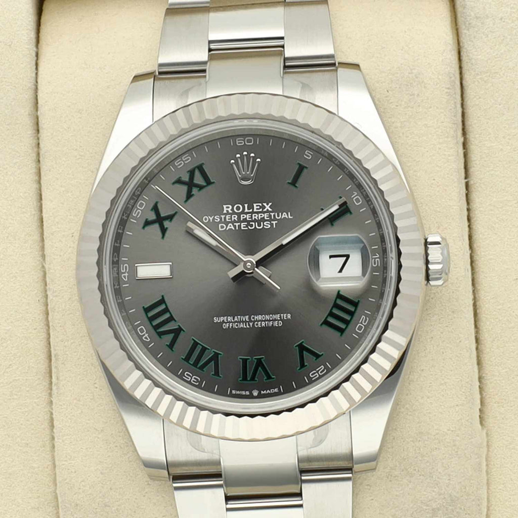 Dit specifieke exemplaar betreft de Rolex Datejust 126334 Wimbledon en verkeert in nieuw staat (unworn). Het horloge is uitgevoerd met een 41 mm Oystersteel-kast, een leigrijze Wimbledon-wijzerplaat met groene Romeinse cijfers, een gekarteerde bezel van 18k witgoud en de sportieve Oyster-band. Het automatische Rolex uurwerk biedt een gangreserve van circa 70 uur en is waterdicht tot 100 meter.