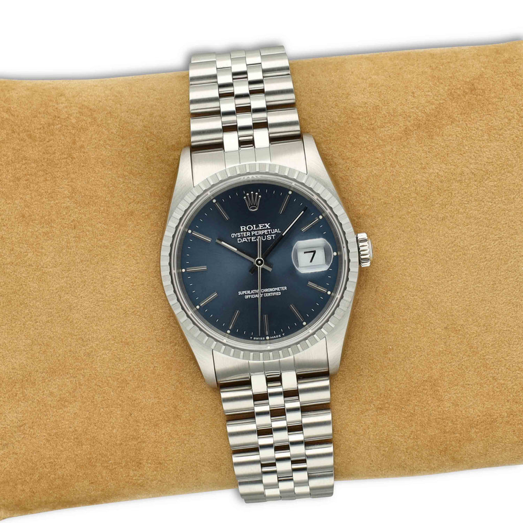 Dit specifieke horloge betreft een bijzondere en zeldzame set. Het uurwerk is van origine een Rolex Datejust referentie 16200 en werd destijds nieuw aangeschaft bij een officiële dealer in Nederland (aankoopbon aanwezig). Op verzoek van de eerste eigenaar is de oorspronkelijke smooth bezel vervangen door een engine turned bezel, een configuratie die destijds mogelijk was, maar vandaag de dag niet meer door Rolex wordt aangeboden.
