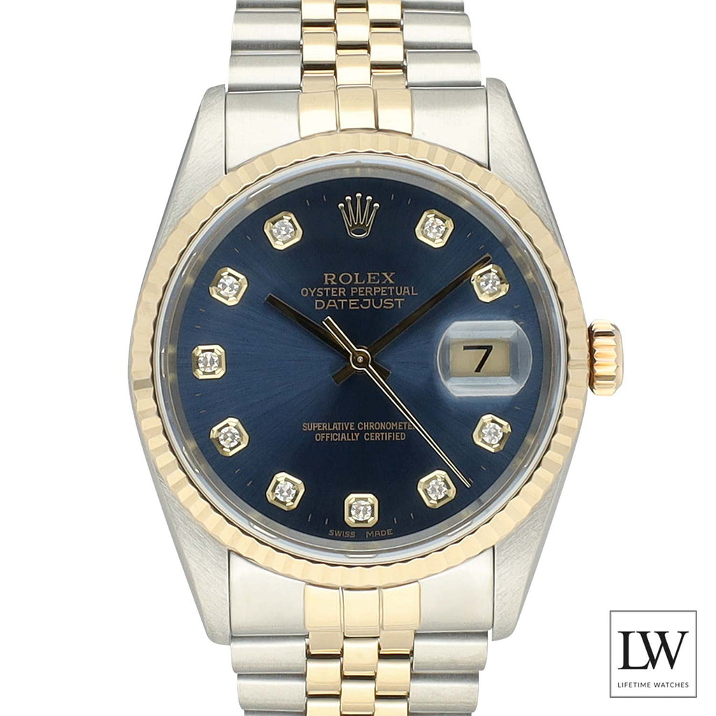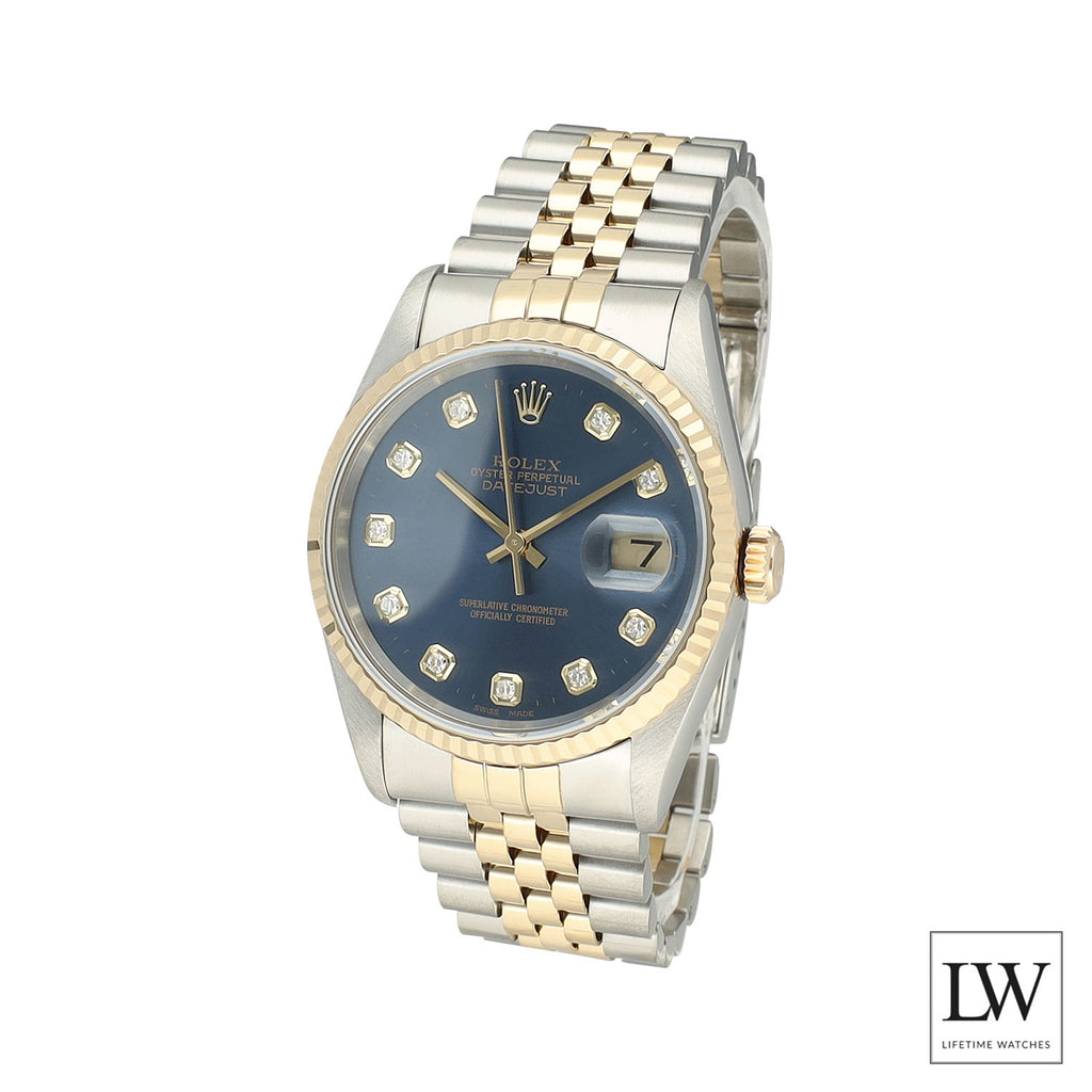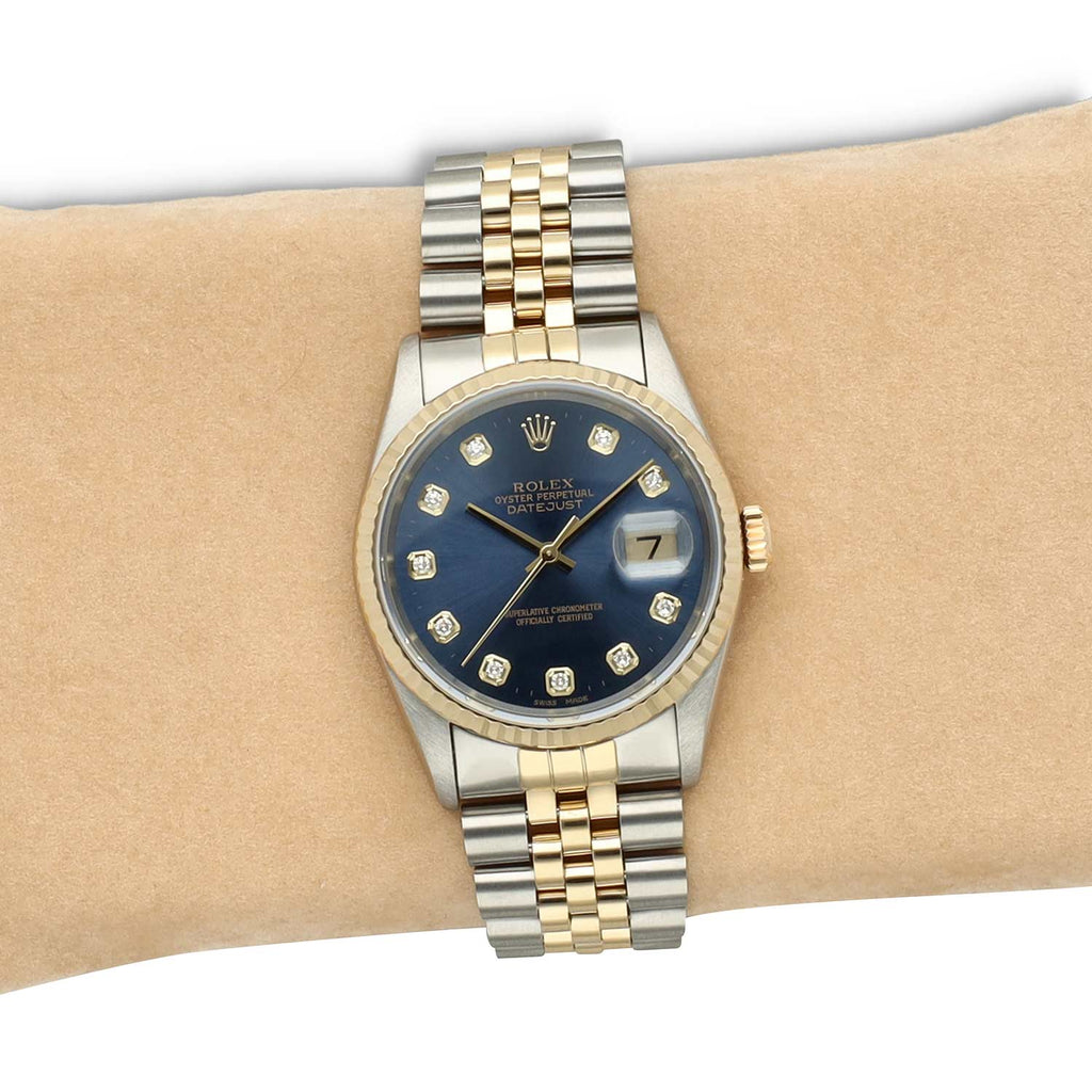 Dit exemplaar betreft een Rolex Datejust 16233 uit 1995, uitgevoerd in Oystersteel en 18 karaat geelgoud met de kenmerkende fluted bezel. De blauwe wijzerplaat met grote diamant uurmarkeringen geeft dit klassieke 36 mm model een opvallende en luxueuze uitstraling, perfect gecombineerd met de elegante Jubilee band.