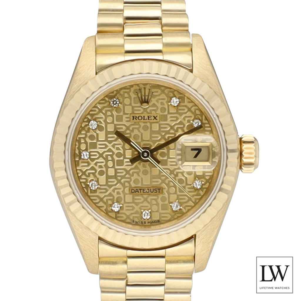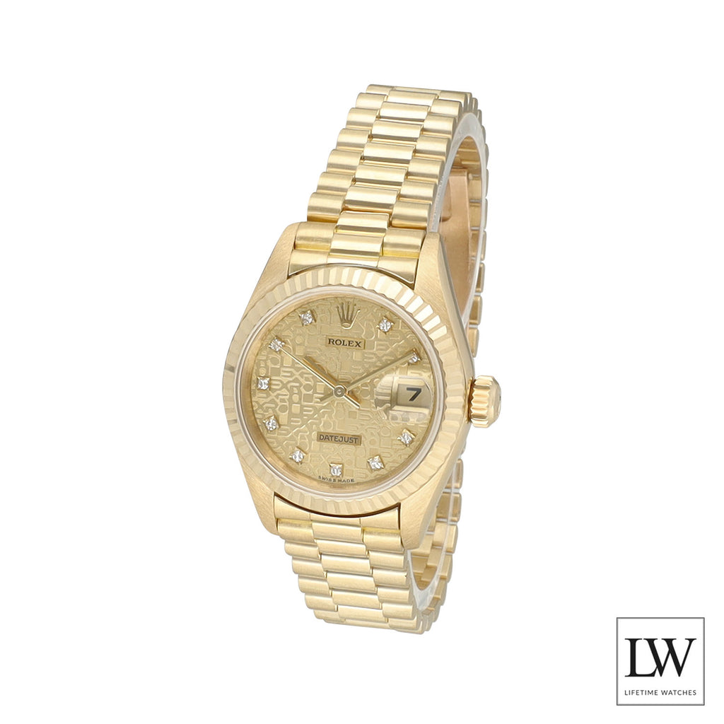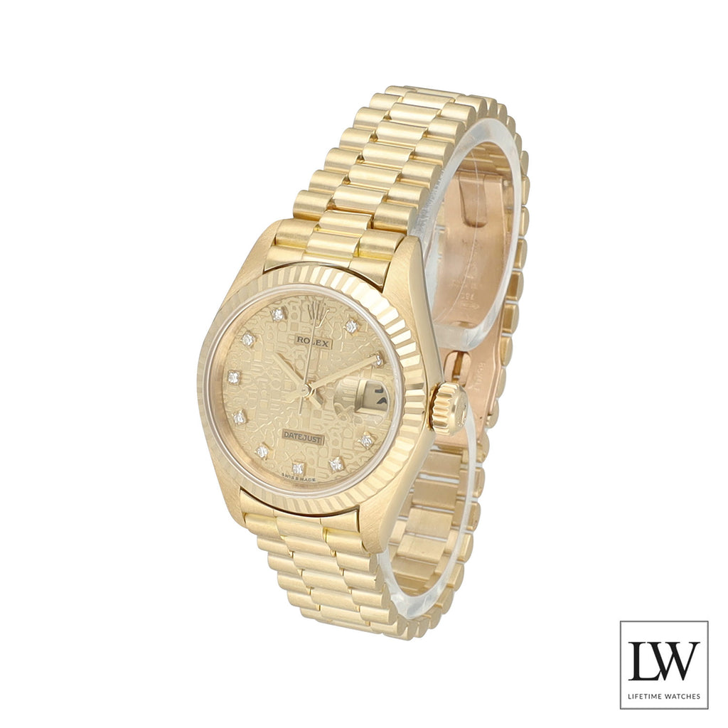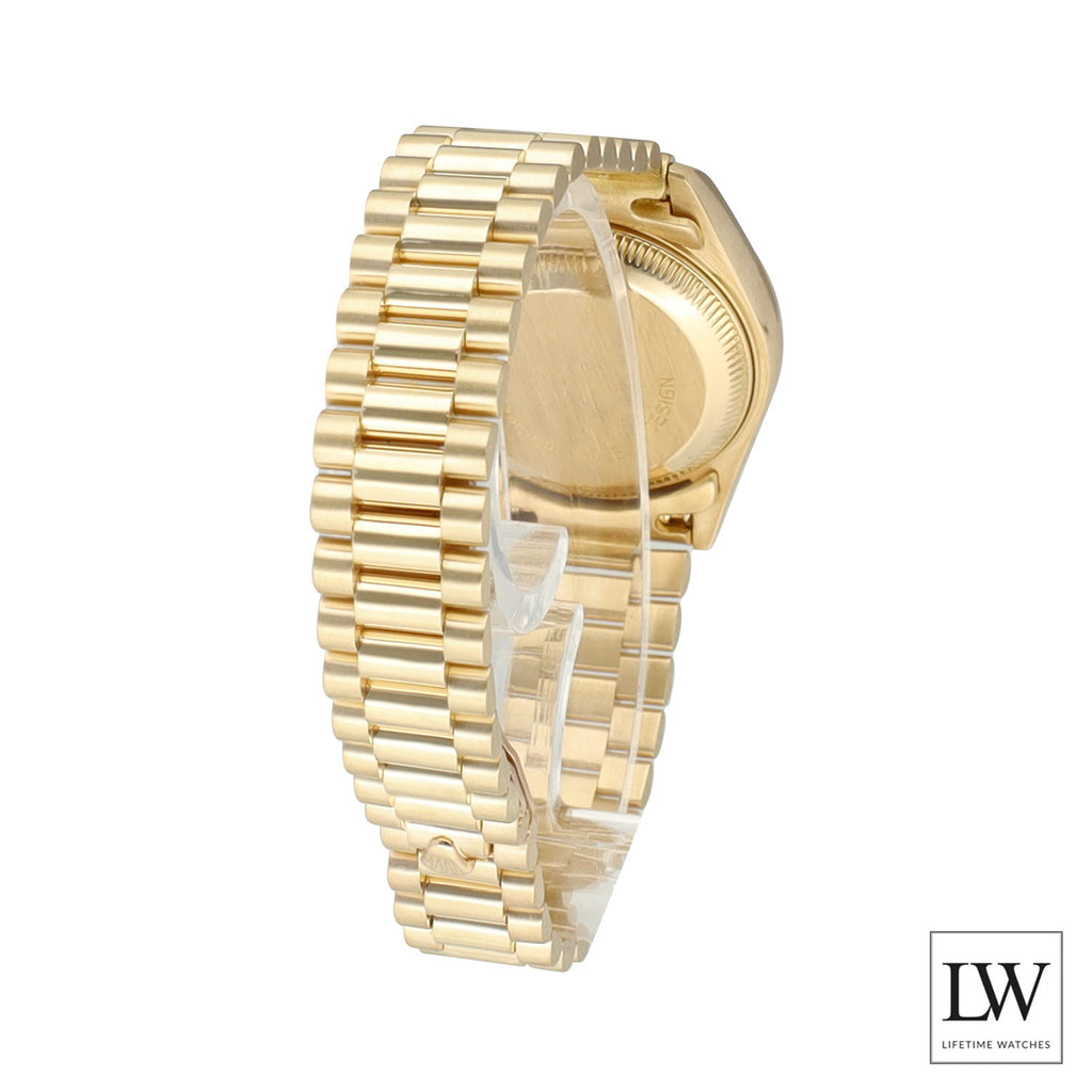 Deze Rolex Lady-Datejust 26 mm met referentie 69178 betreft een stijlvol exemplaar uit 1991. Het horloge is volledig uitgevoerd in 18 karaat geelgoud en afgewerkt met een geelgouden fluted bezel. De champagne Jubilee wijzerplaat met diamond uurmarkeringen geeft het horloge een verfijnde en luxueuze uitstraling. In combinatie met de President bracelet ontstaat een klassiek en uiterst vrouwelijk geheel met een warme, chique uitstraling.