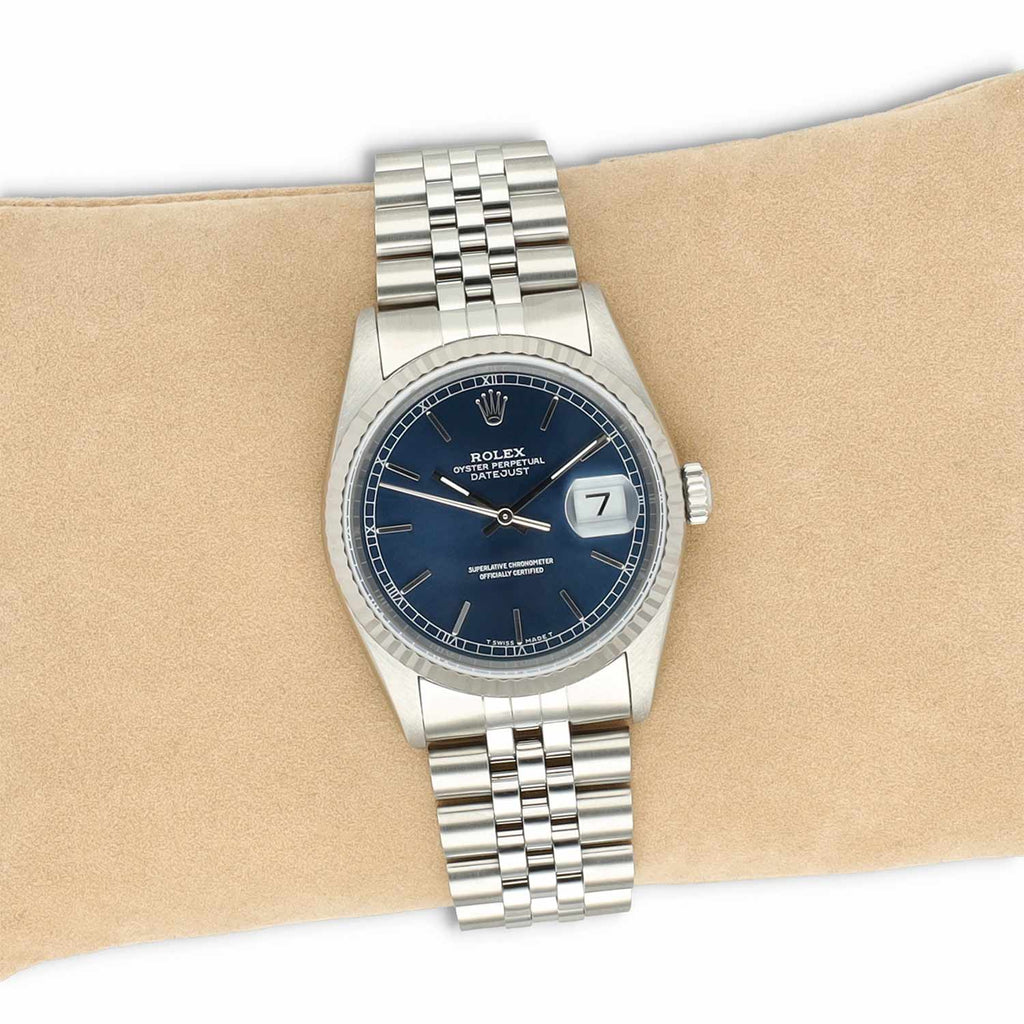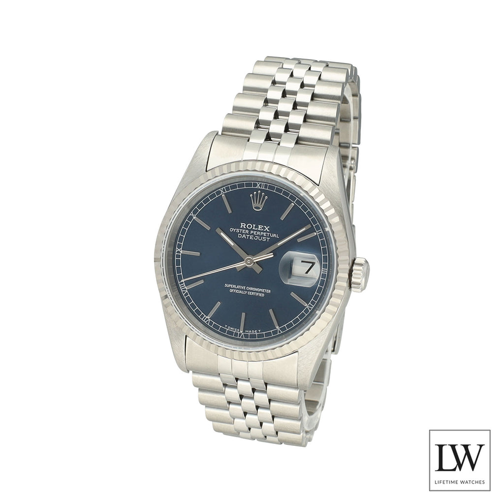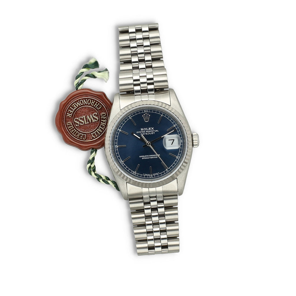 Deze Rolex Datejust 16234 betreft een prachtig exemplaar uit 1996. Het horloge is uitgevoerd in Oystersteel en voorzien van een witgouden gekartelde bezel. De blauwe minute track wijzerplaat geeft het horloge een frisse, sportieve en tegelijkertijd elegante uitstraling.
