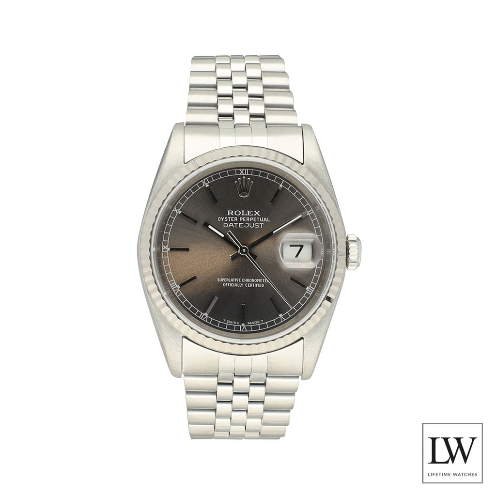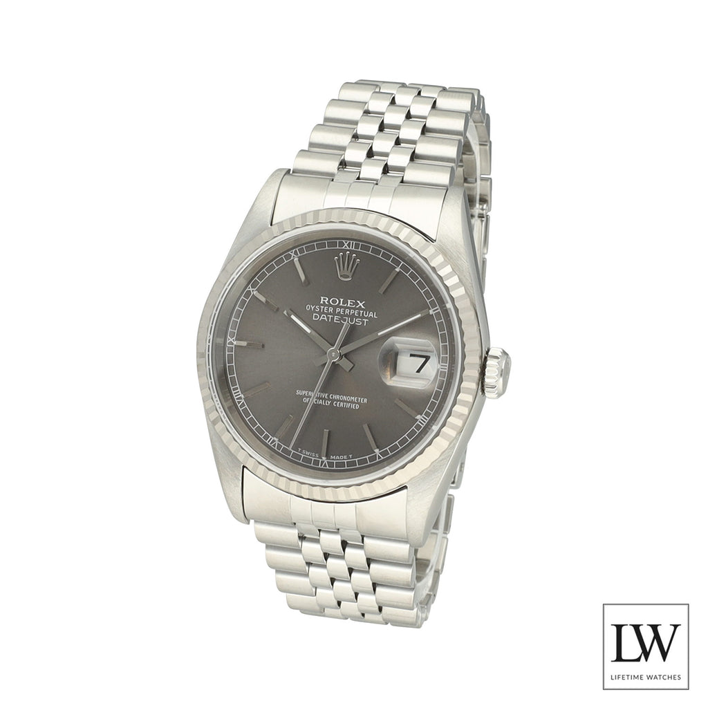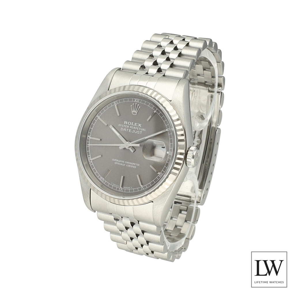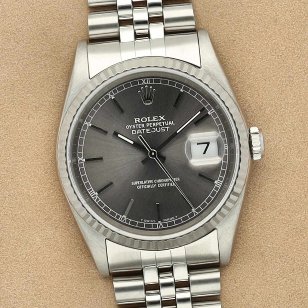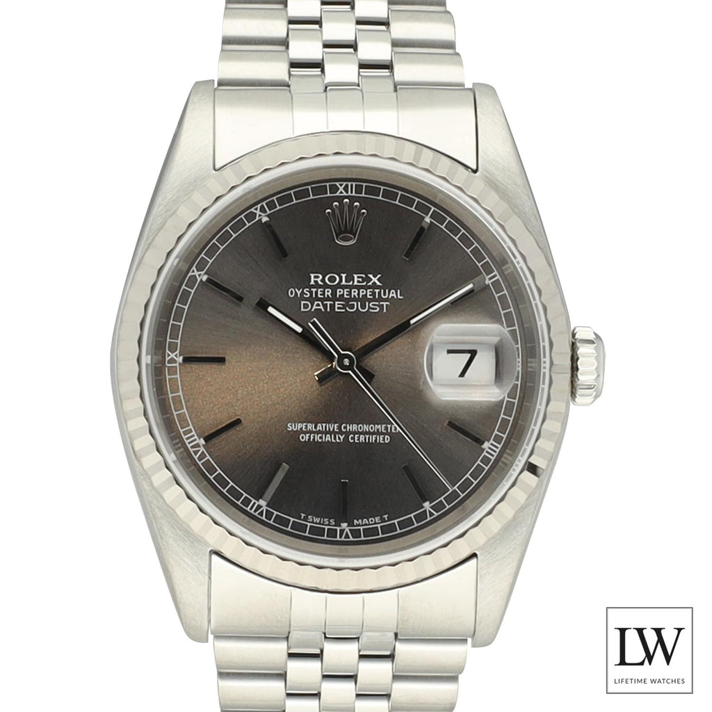 Deze Rolex Datejust 16234 betreft een elegant exemplaar in perfecte staat uit 1995. Het horloge is uitgevoerd in Oystersteel en voorzien van een witgouden gekartelde bezel. De grijze minute track wijzerplaat geeft het horloge een rustige, verfijnde uitstraling en onderstreept het tijdloze karakter van dit model.