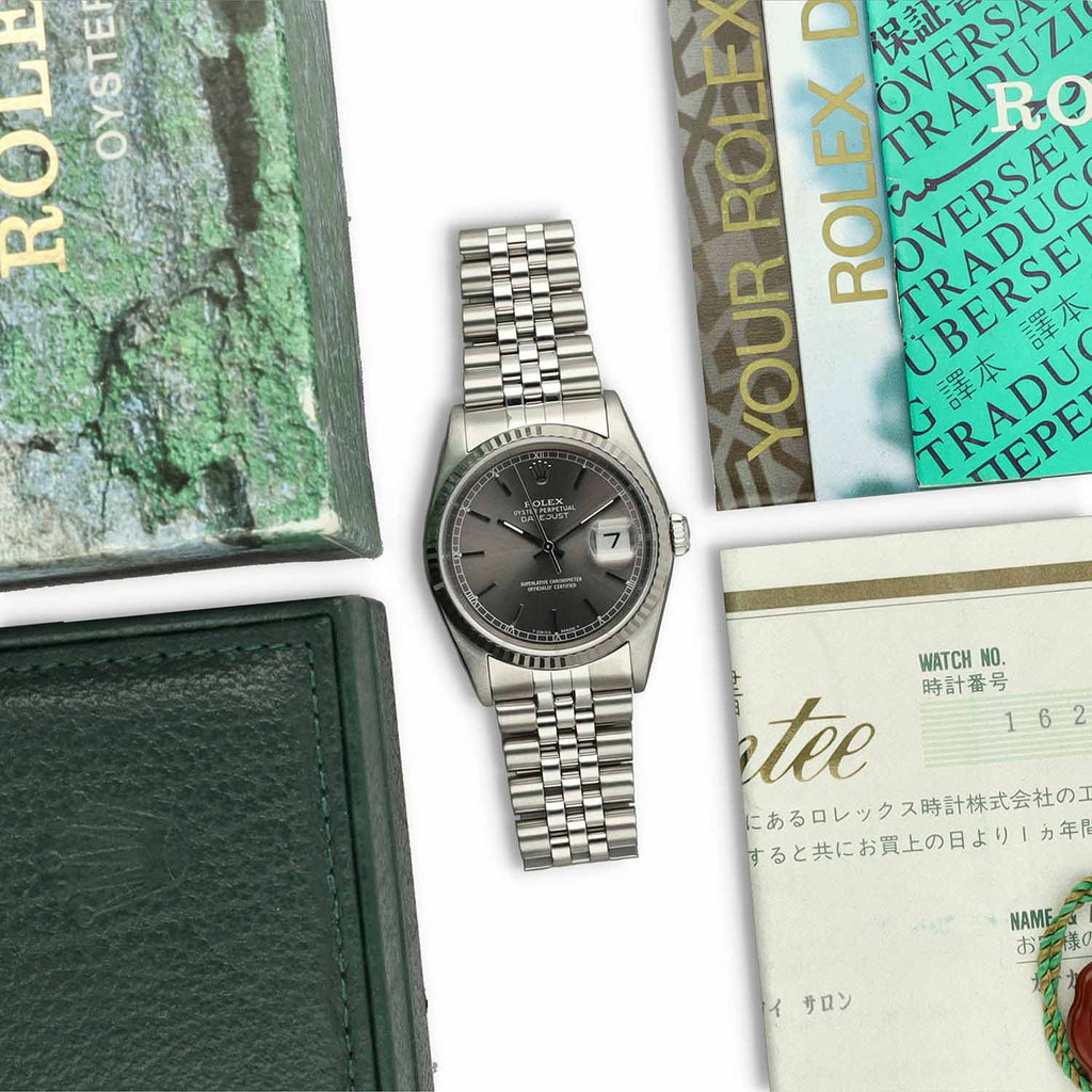 Het horloge verkeert in uitstekende conditie, geserviced en wordt geleverd als full set, inclusief originele Rolex doos en papieren. Daarnaast is het gecontroleerd op echtheid en technische staat en wordt het geleverd met 24 maanden garantie, zodat u deze tijdloze Datejust met volledig vertrouwen kunt dragen.