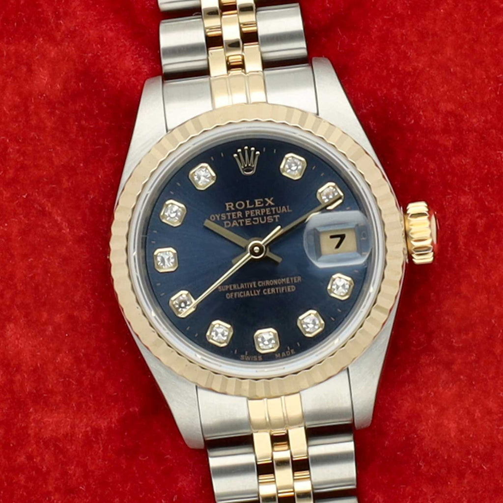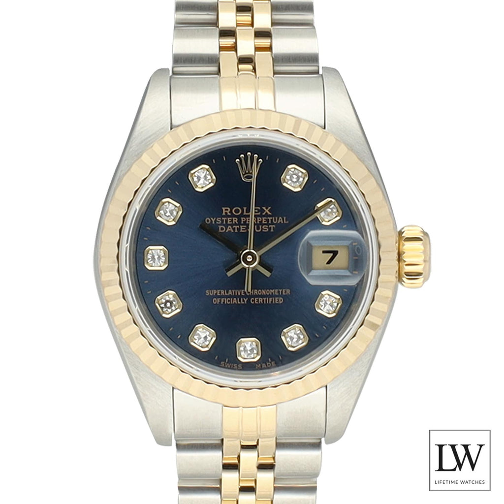 Deze Rolex Lady-Datejust 31 mm uit 1999 met referentie 79173 combineert Oystersteel en 18 karaat geelgoud en is voorzien van een elegante fluted bezel. De luxueuze blauwe wijzerplaat met grote diamanten geeft het horloge een exclusieve en vrouwelijke uitstraling.