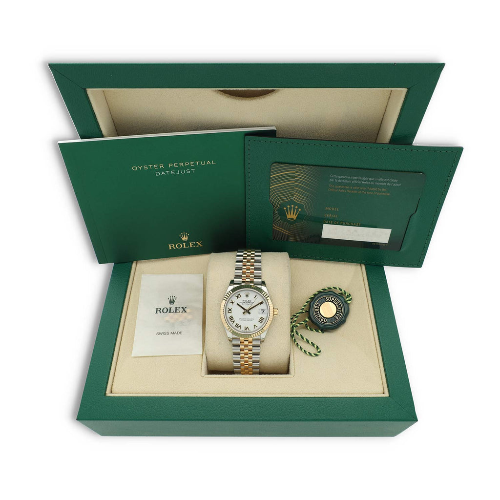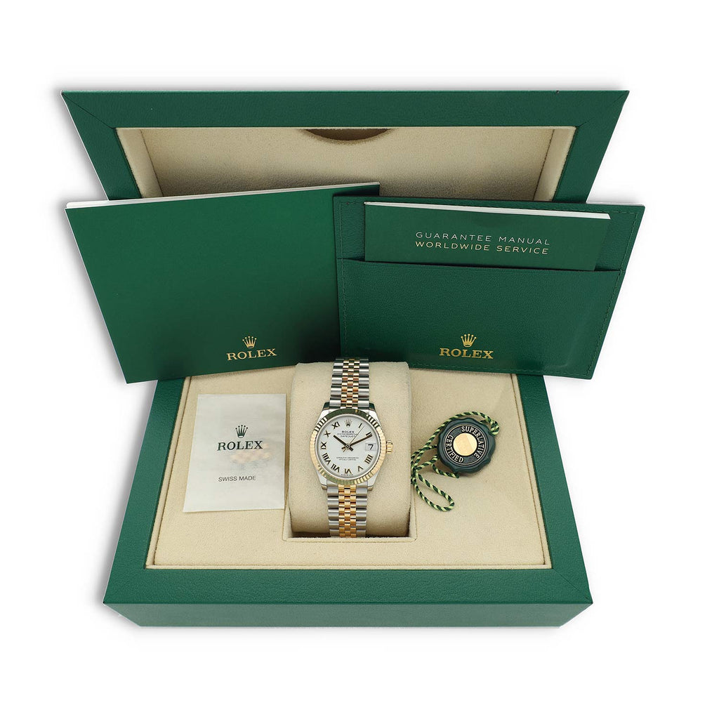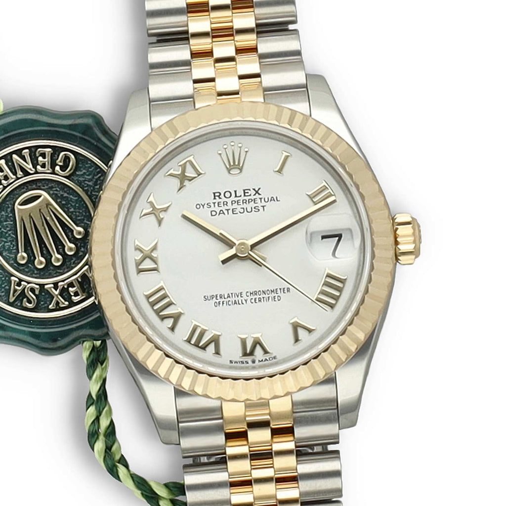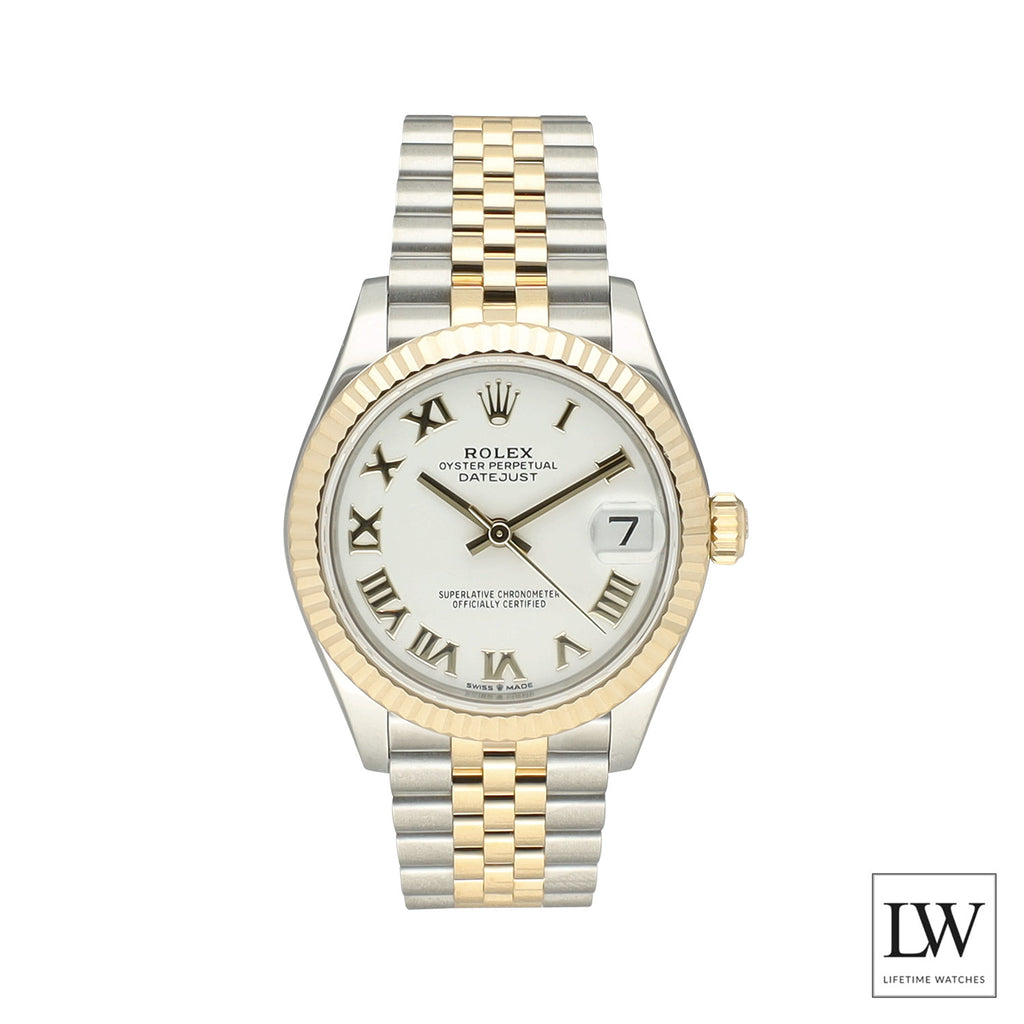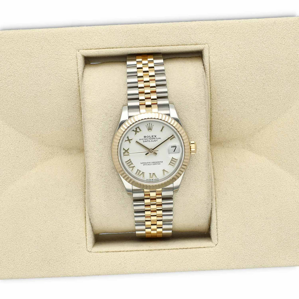 Deze Rolex Datejust 31 met referentie 278273 betreft een 99% nieuw exemplaar uit 2024. Het horloge is uitgevoerd in Oystersteel en 18 karaat geelgoud en afgewerkt met een geelgouden gekartelde bezel. De witte Roman wijzerplaat geeft het horloge een elegante, klassieke uitstraling. De Jubilee band, speciaal ontworpen voor de Datejust, staat bekend om zijn uitstekende draagcomfort en verfijnde uitstraling.