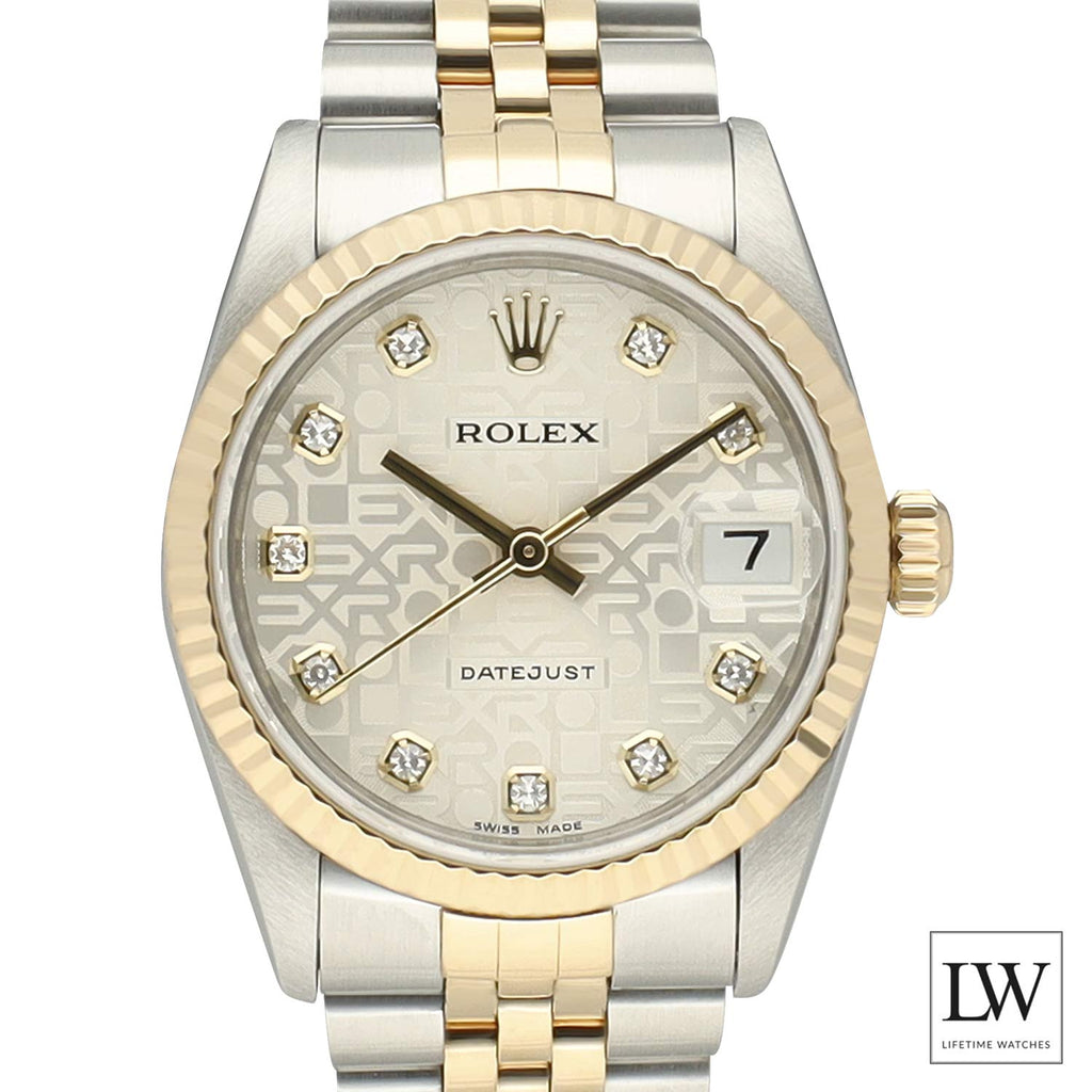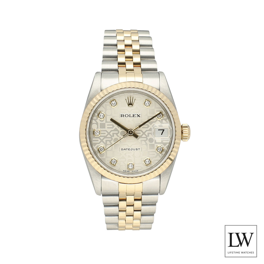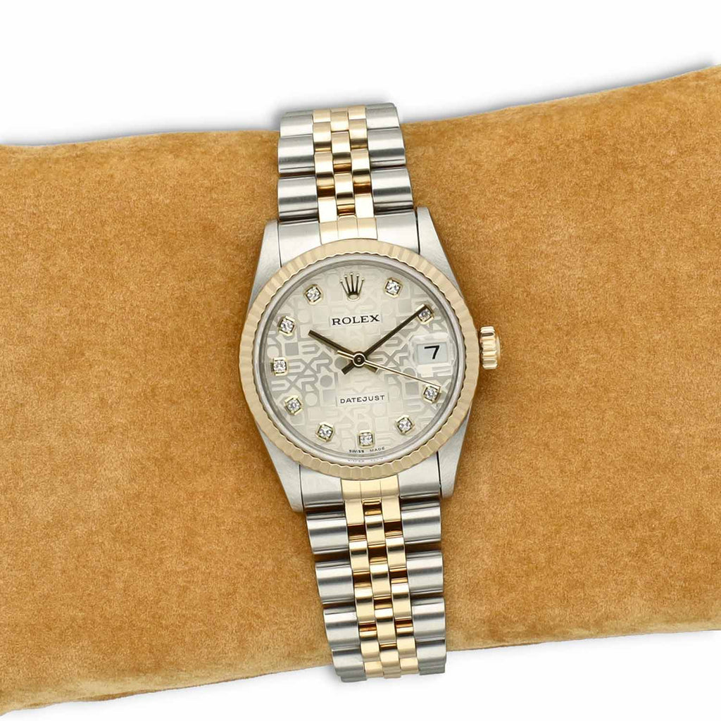 Deze Datejust Midsize 31 mm met referentie 68273 uit 1995 combineert Oystersteel en 18 karaat geelgoud met een elegante fluted bezel. Wat dit exemplaar bijzonder maakt, is de zeldzame en luxueuze Silver Jubilee Big Diamond dial – een wijzerplaat die direct in het oog springt door haar schitterende uitstraling en exclusiviteit.