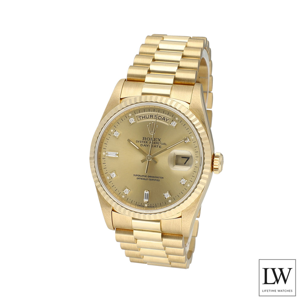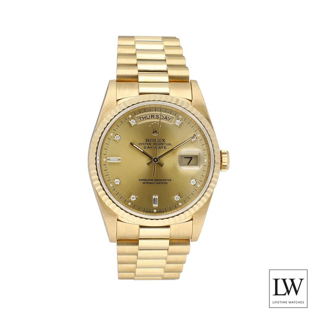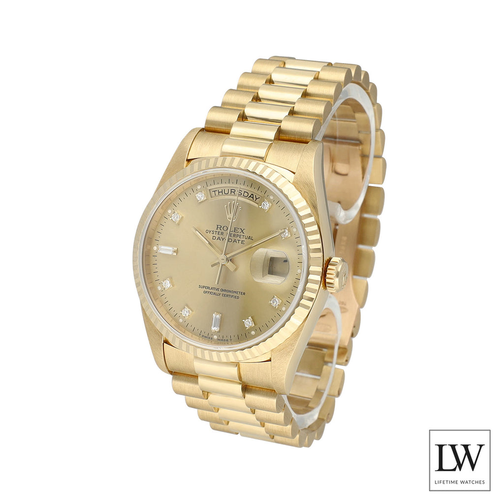 Dit pre-owned exemplaar betreft een Rolex Day Date referentie 18238 uit 1995. De 36 mm kast is volledig uitgevoerd in 18 karaat geelgoud en afgewerkt met een geelgouden gekartelde bezel. De champagne wijzerplaat met diamond uurmarkeringen geeft het horloge een uitgesproken luxe uitstraling. In combinatie met de President band ontstaat een krachtig en tijdloos geheel met onmiskenbare presence.
