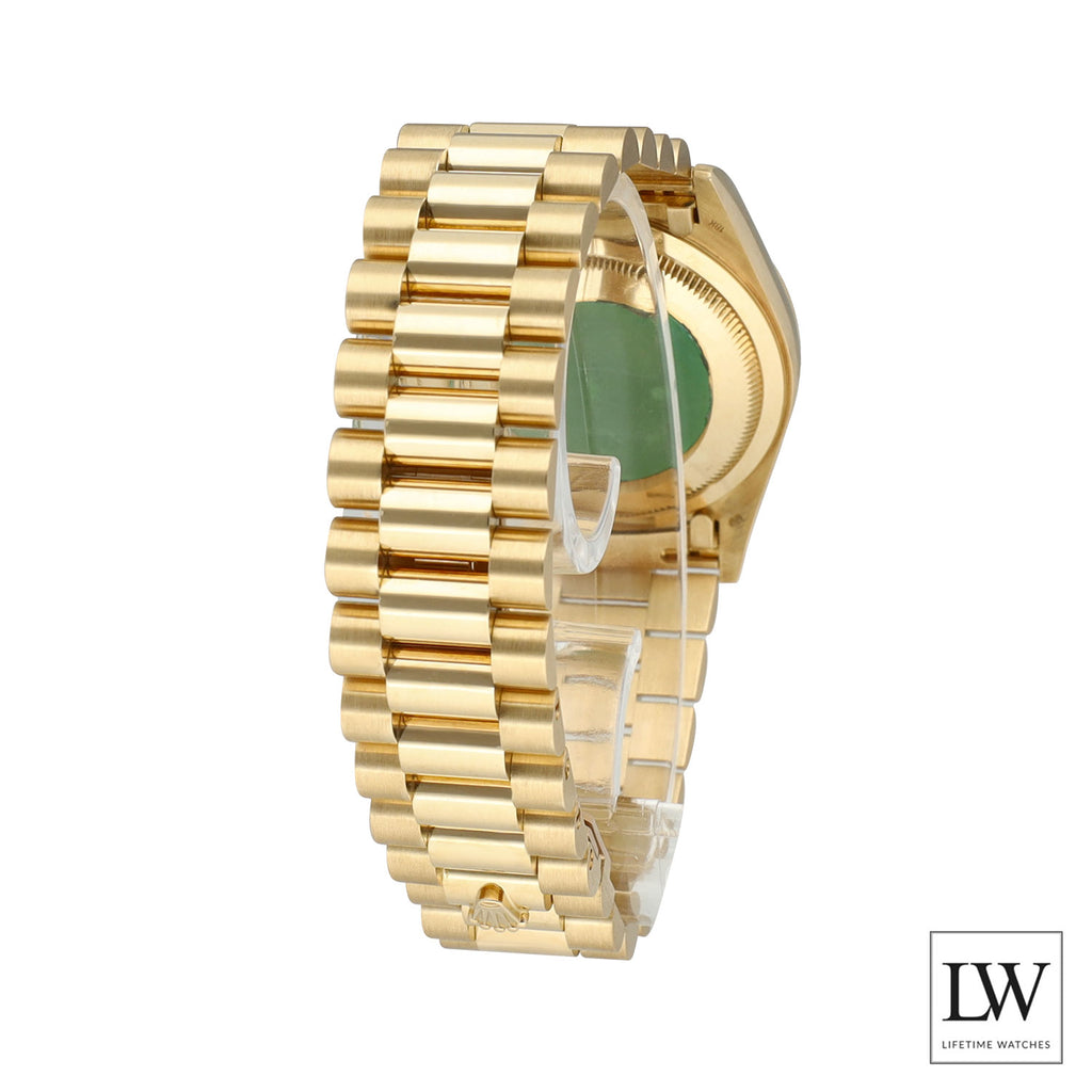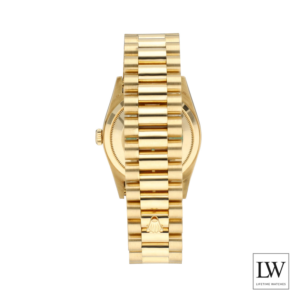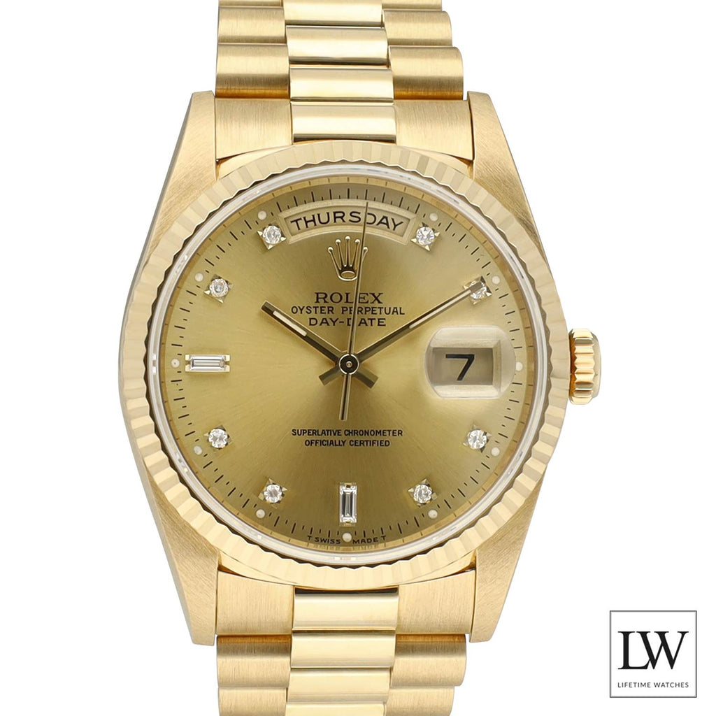 Dit pre-owned exemplaar betreft een Rolex Day Date referentie 18238 uit 1995. De 36 mm kast is volledig uitgevoerd in 18 karaat geelgoud en afgewerkt met een geelgouden gekartelde bezel. De champagne wijzerplaat met diamond uurmarkeringen geeft het horloge een uitgesproken luxe uitstraling. In combinatie met de President band ontstaat een krachtig en tijdloos geheel met onmiskenbare presence.