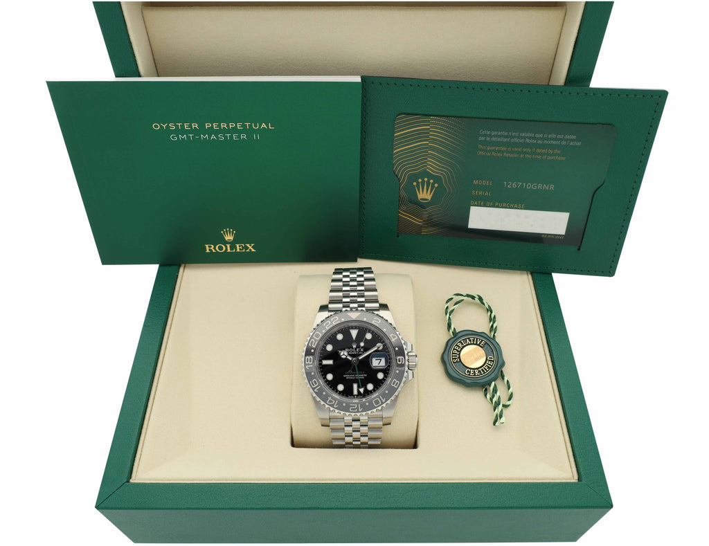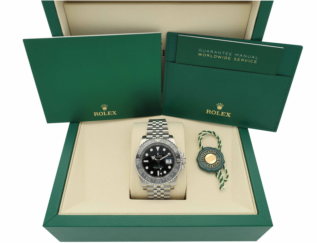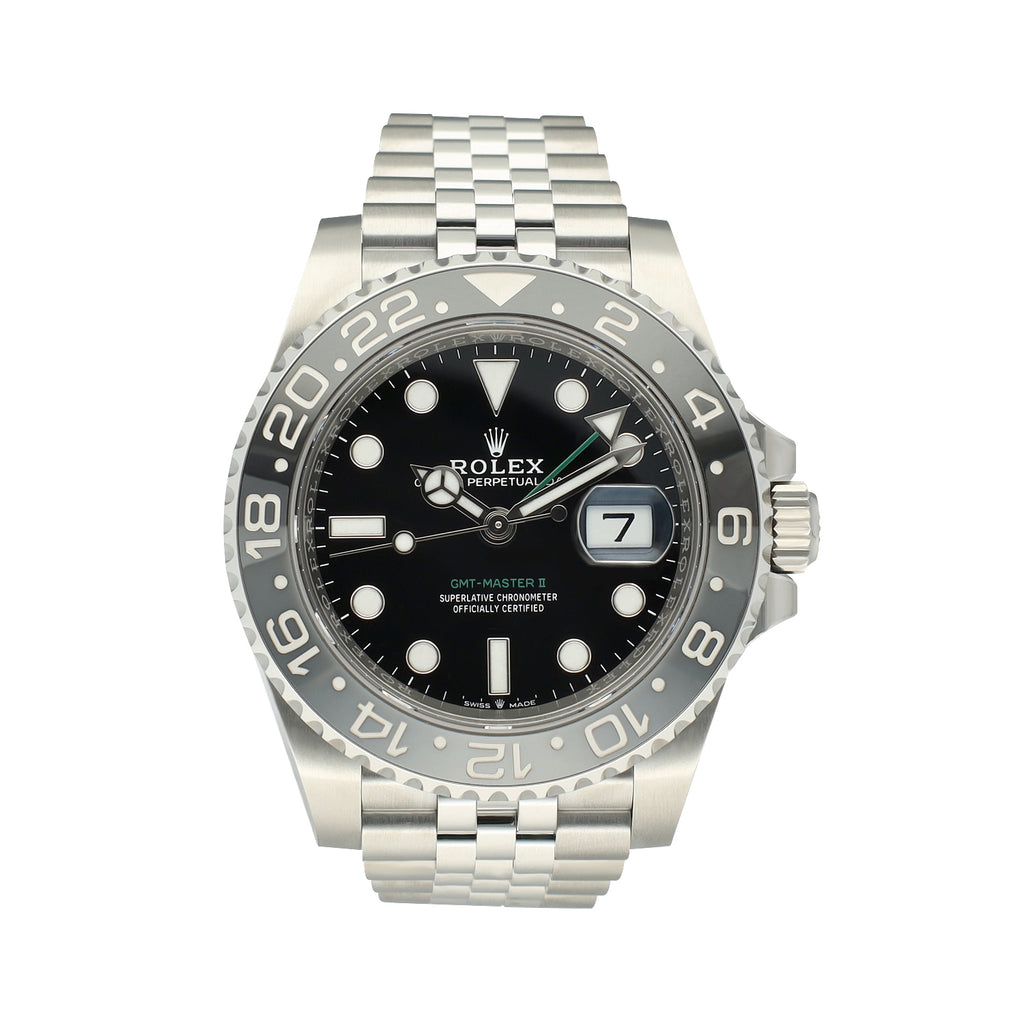 Deze Rolex GMT-Master II 126710GRNR betreft een pre-owned exemplaar uit 2024. Het horloge is uitgevoerd met een 40 mm Oystersteel kast, een zwarte wijzerplaat en een zwarte en grijze keramische Cerachrom-bezel, wat zorgt voor een moderne en krachtige uitstraling. De Jubilee band biedt uitstekend draagcomfort en vormt een elegante balans met het sportieve karakter van het horloge. Het automatische Rolex uurwerk is een gecertificeerde chronometer met een gangreserve van circa 70 uur.
