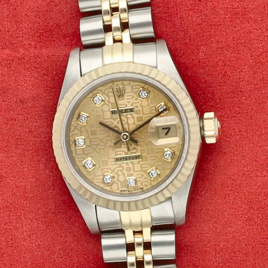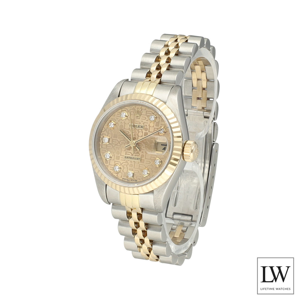 Deze Lady-Datejust 69173 uit 1996 is uitgevoerd in Oystersteel en 18 karaat geelgoud met een 26 mm kast en een gekartelde bezel. De exclusieve Champagne Jubilee-wijzerplaat met grote diamantindexen geeft dit horloge een luxueuze en opvallende uitstraling. De Jubilee-band met vouwsluiting zorgt voor het kenmerkende draagcomfort en de klassieke Rolex-look.