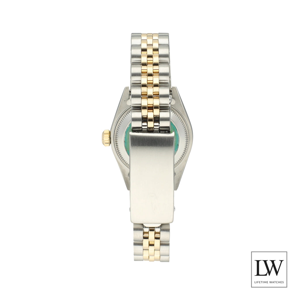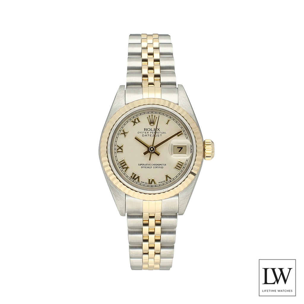 Deze Rolex Lady-Datejust 26 mm met referentie 79173 uit het jaar 2000 is uitgevoerd in een klassieke combinatie van Oystersteel en 18 karaat geelgoud en beschikt over een elegante gekartelde bezel. Wat dit horloge bijzonder maakt, is de zeldzame Ivory Pyramid Roman wijzerplaat, voorzien van verfijnde Romeinse cijfers en een unieke textuur die het horloge een exclusieve en luxueuze uitstraling geeft.