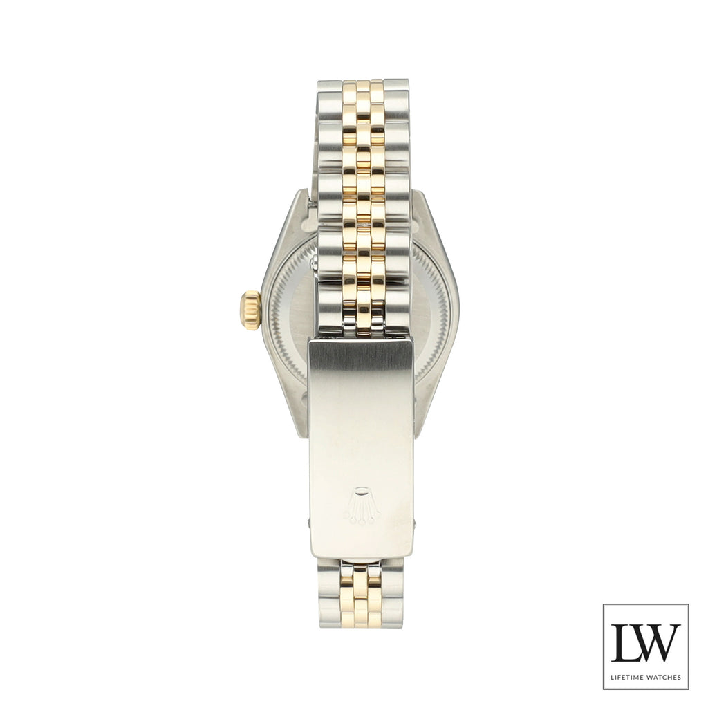 Deze Rolex Lady-Datejust 79173 uit 2001 heeft een kastdiameter van 26 mm en is uitgevoerd in de klassieke combinatie van Oystersteel en 18 karaat geelgoud, afgewerkt met een geelgouden gekartelde bezel. De wijzerplaat met grote diamanten uurmarkeringen geeft het horloge een uitgesproken luxe en exclusieve uitstraling.