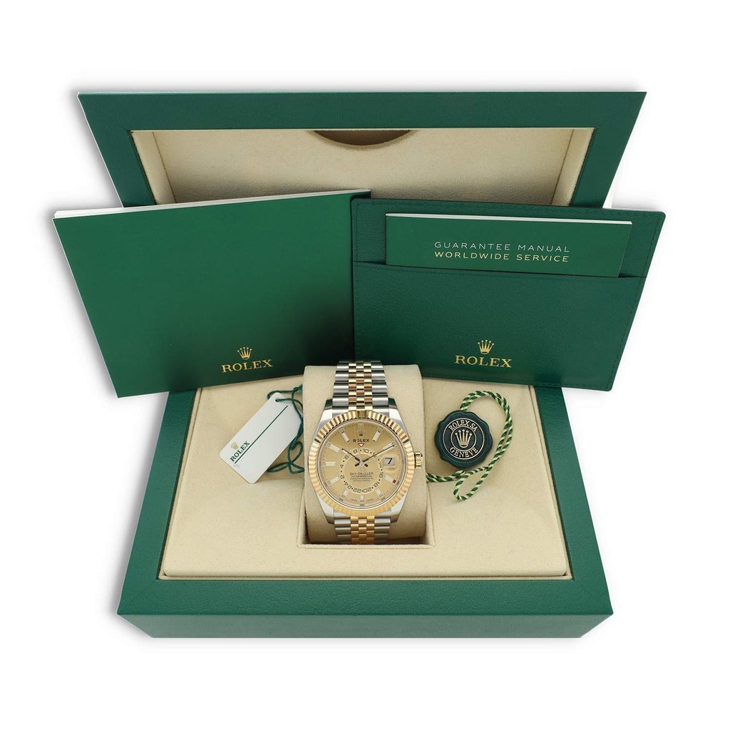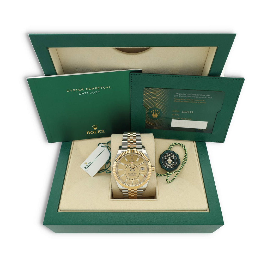 Deze Rolex Sky-Dweller 326933 uit 2023 is een waar toonbeeld van luxe, vakmanschap en functionaliteit. De uitvoering in Oystersteel en 18-karaat geelgoud, gecombineerd met de schitterende champagnekleurige wijzerplaat, geeft het horloge een warme, exclusieve uitstraling die direct herkenbaar is binnen de Sky-Dweller-collectie.