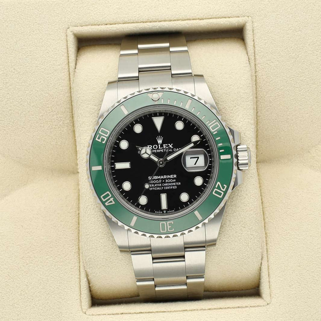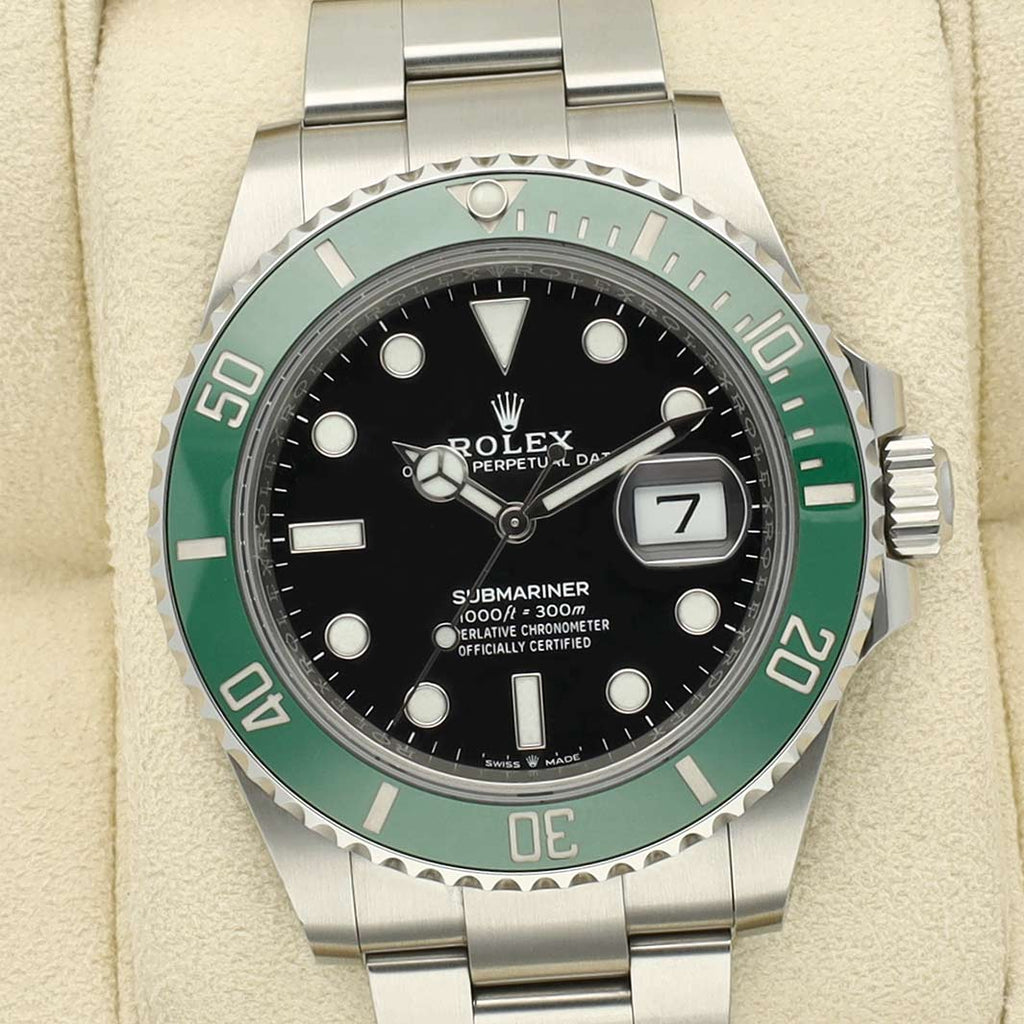 De Submariner Date 126610LV uit 2022, ook wel bekend als de “Starbucks”, beschikt over een 41 mm Oystersteel kast, een diepe zwarte wijzerplaat en een opvallende groene Cerachrom bezel. De combinatie van deze elementen zorgt voor een moderne, herkenbare look die zowel sportief als stijlvol is.